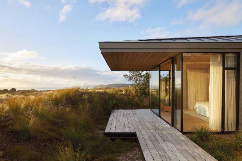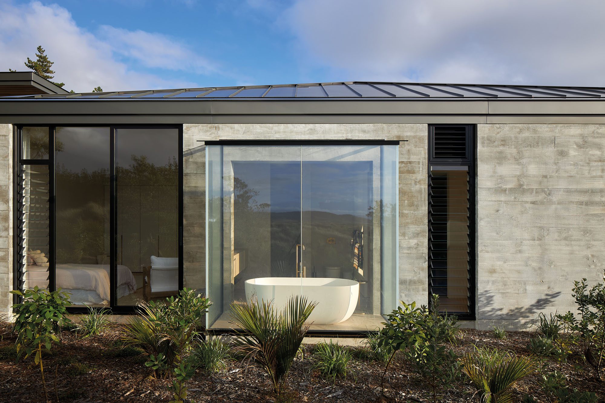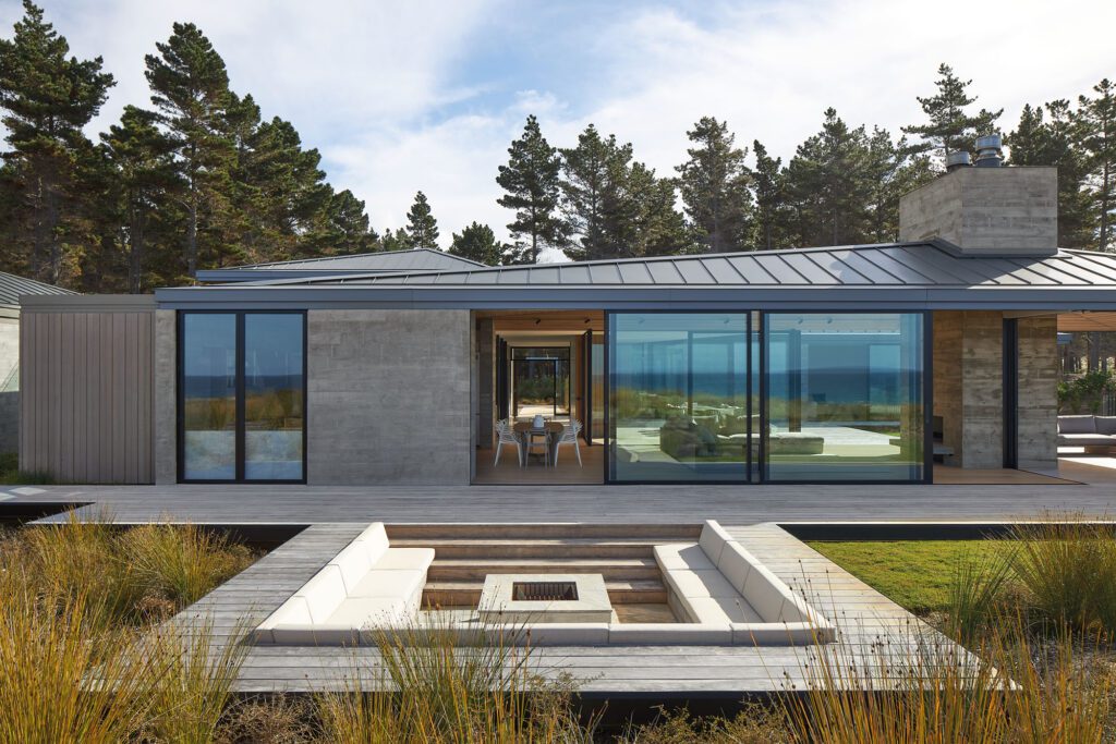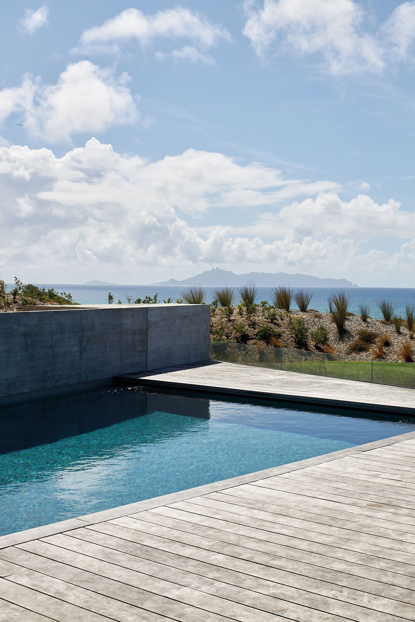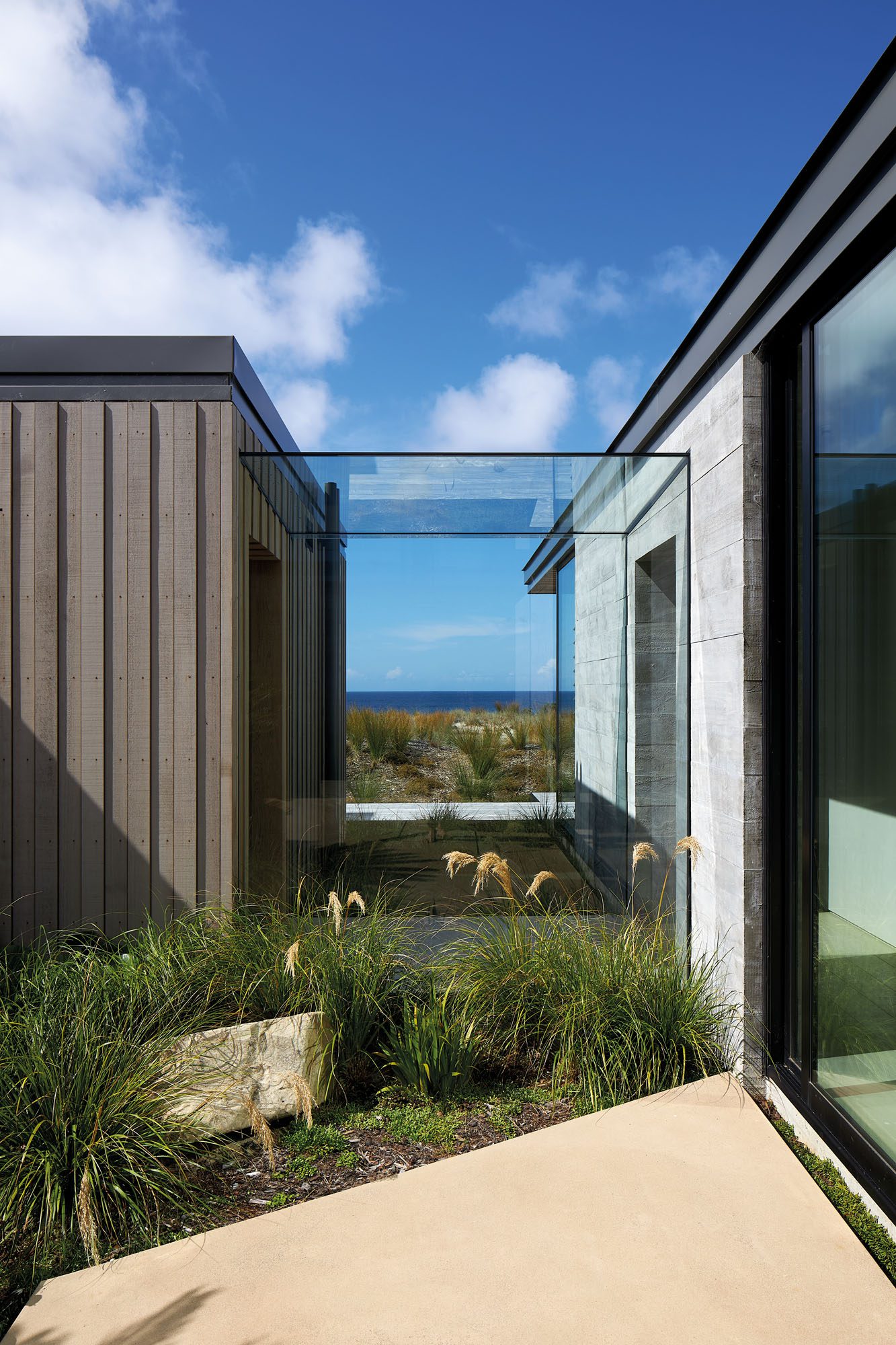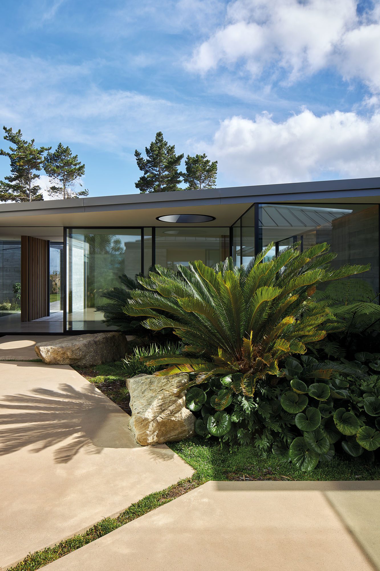Courtyards, terraces and decks wrap around the pavilions. Some are timber-clad; others are lush with toetoe, sago palms, creepers, native tussocks, and boulders, while tall pine trees form a natural screen to the south-west.