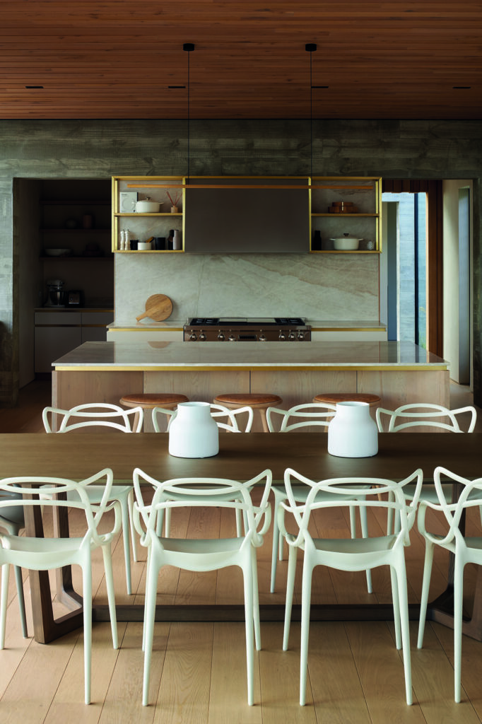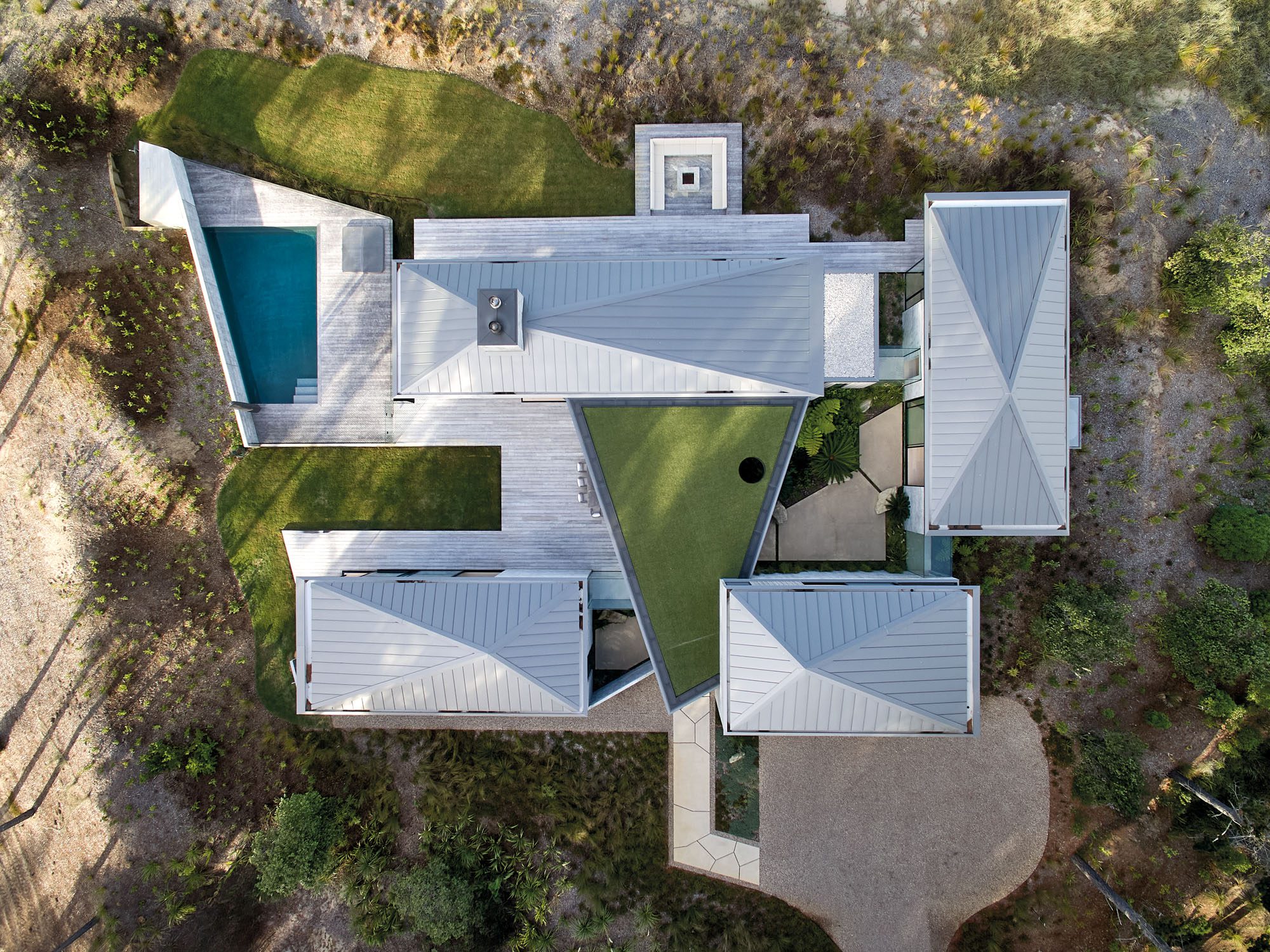 A muted palette of exposed concrete, limestone and bleached oak echoes the sand and driftwood of the coastal setting, while touches of soft brass add warmth and depth to the house’s interior. Roofs are clad in wide-profile, pre-coated aluminium in a schist tone. Above the main courtyard, a triangular canopy clad in artificial turf — complete with a circular lightwell — playfully resembles a golf course.