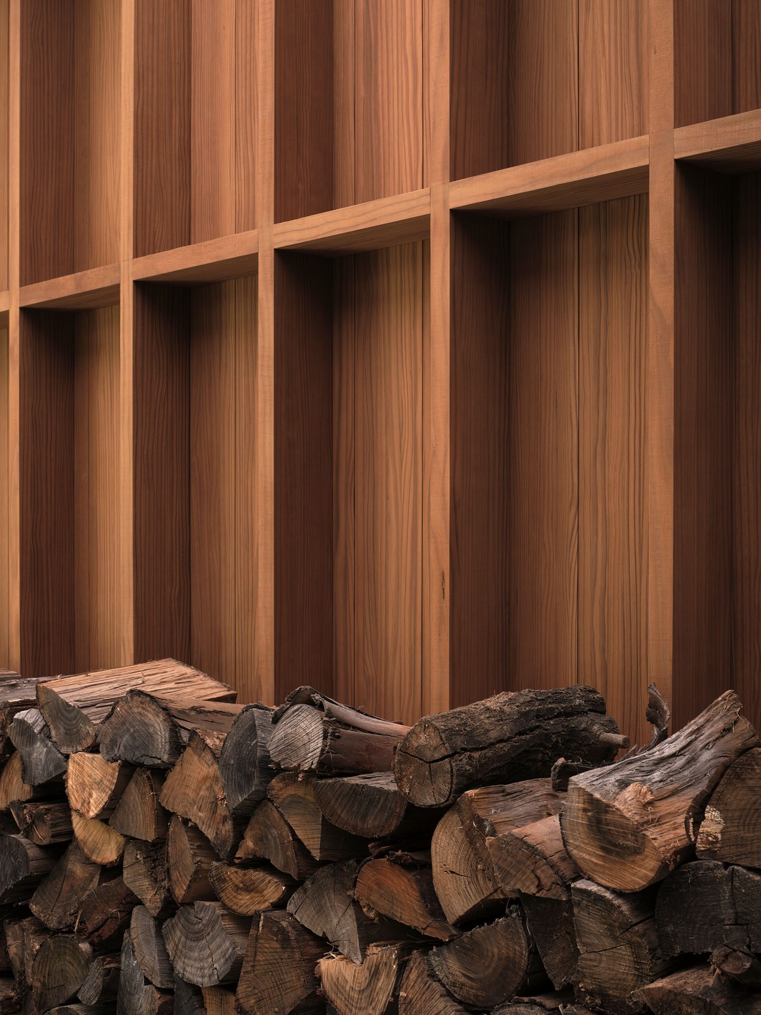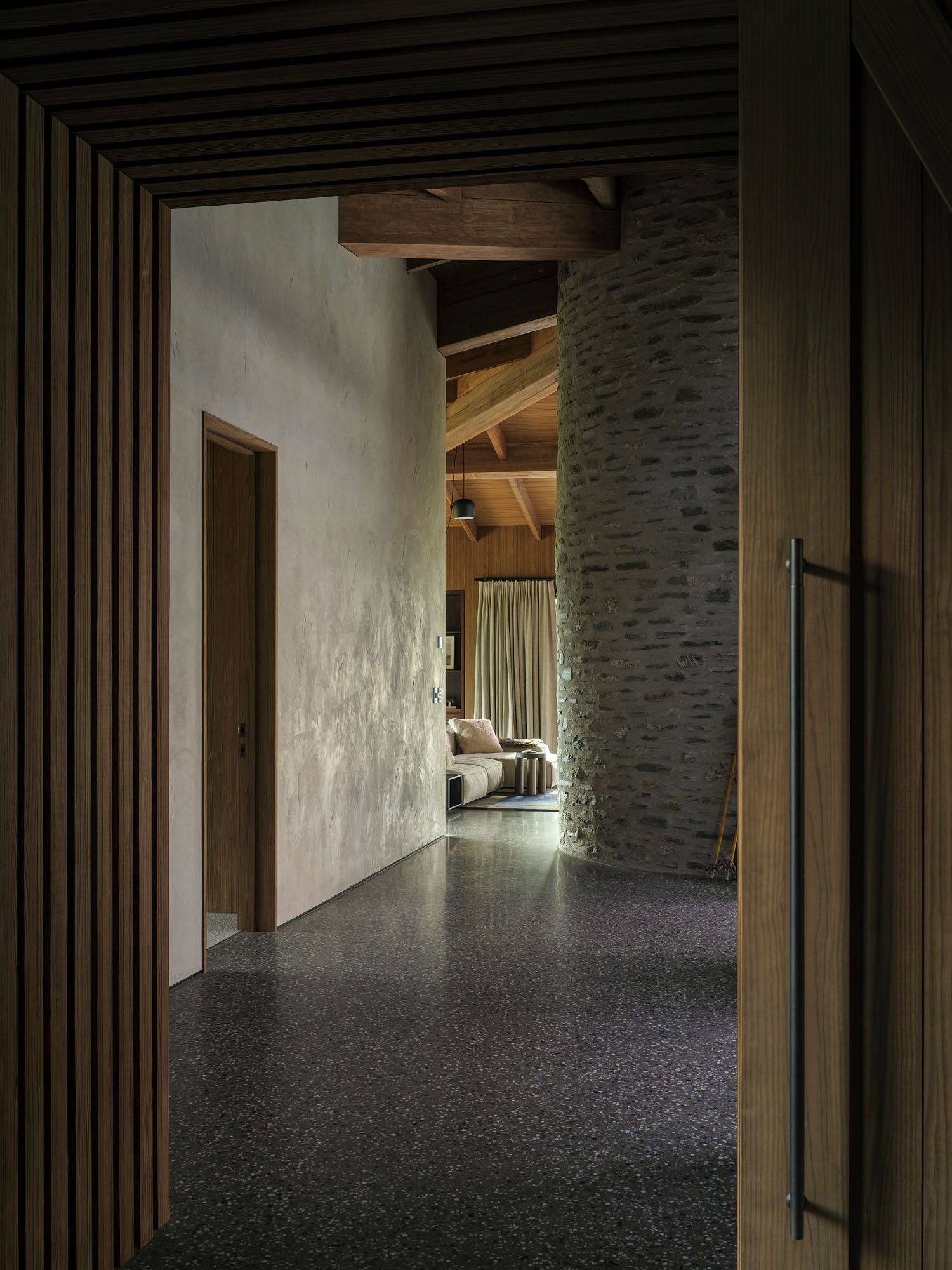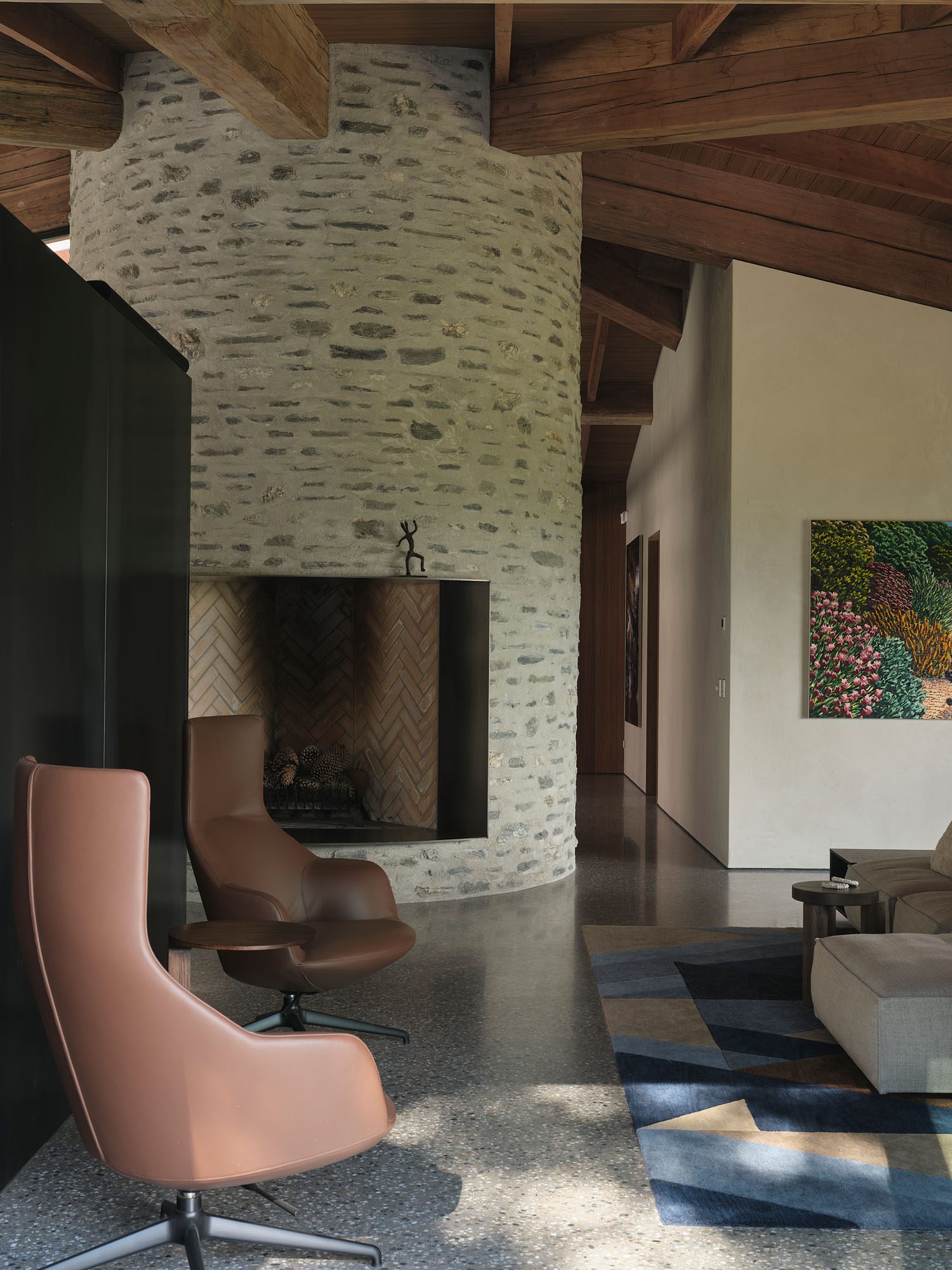 “The stone-clad drum supports a radiating hardwood timber roof structure and also contains fires that serve both indoor and outdoor living,” according to the designers.