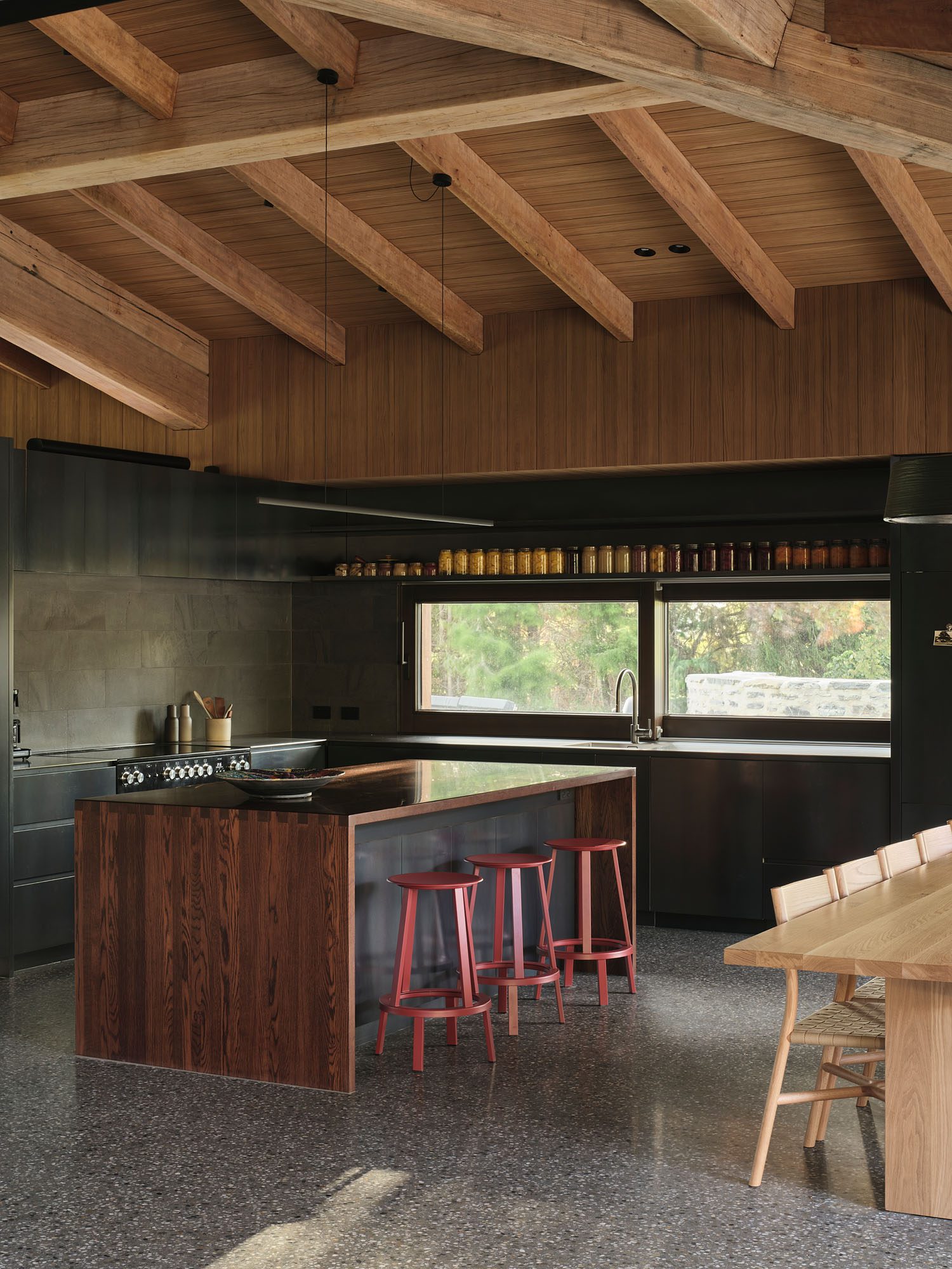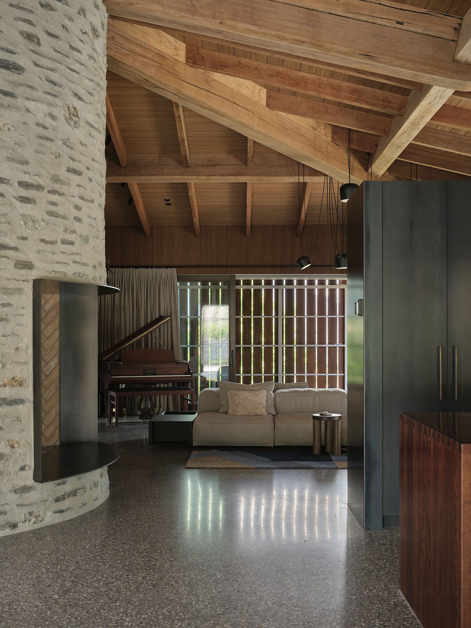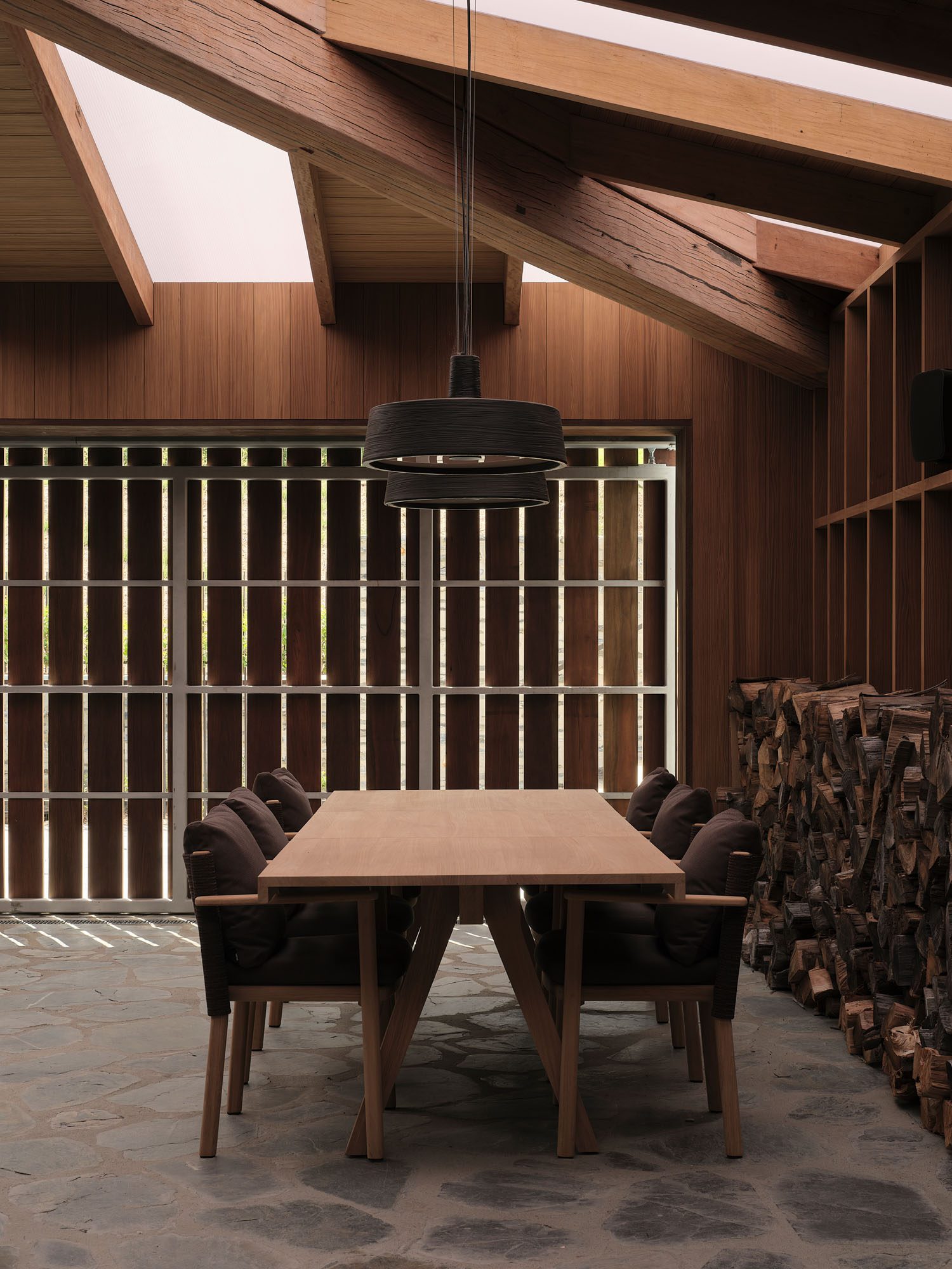 The latter is an impressive centrepiece to the house, acting both as an internal and external fireplace, a social hub, and a structural anchor that holds the large timber beams in place.