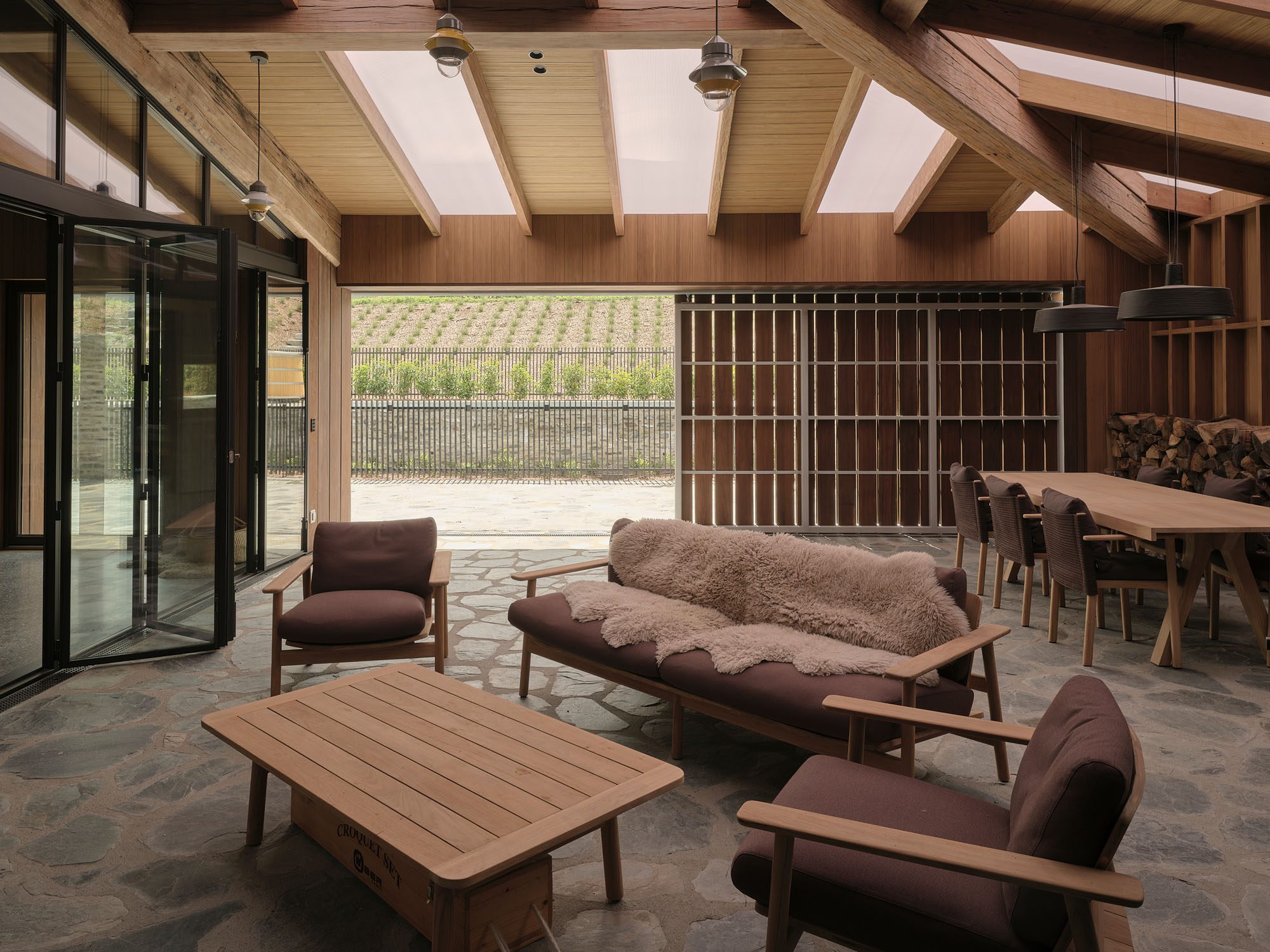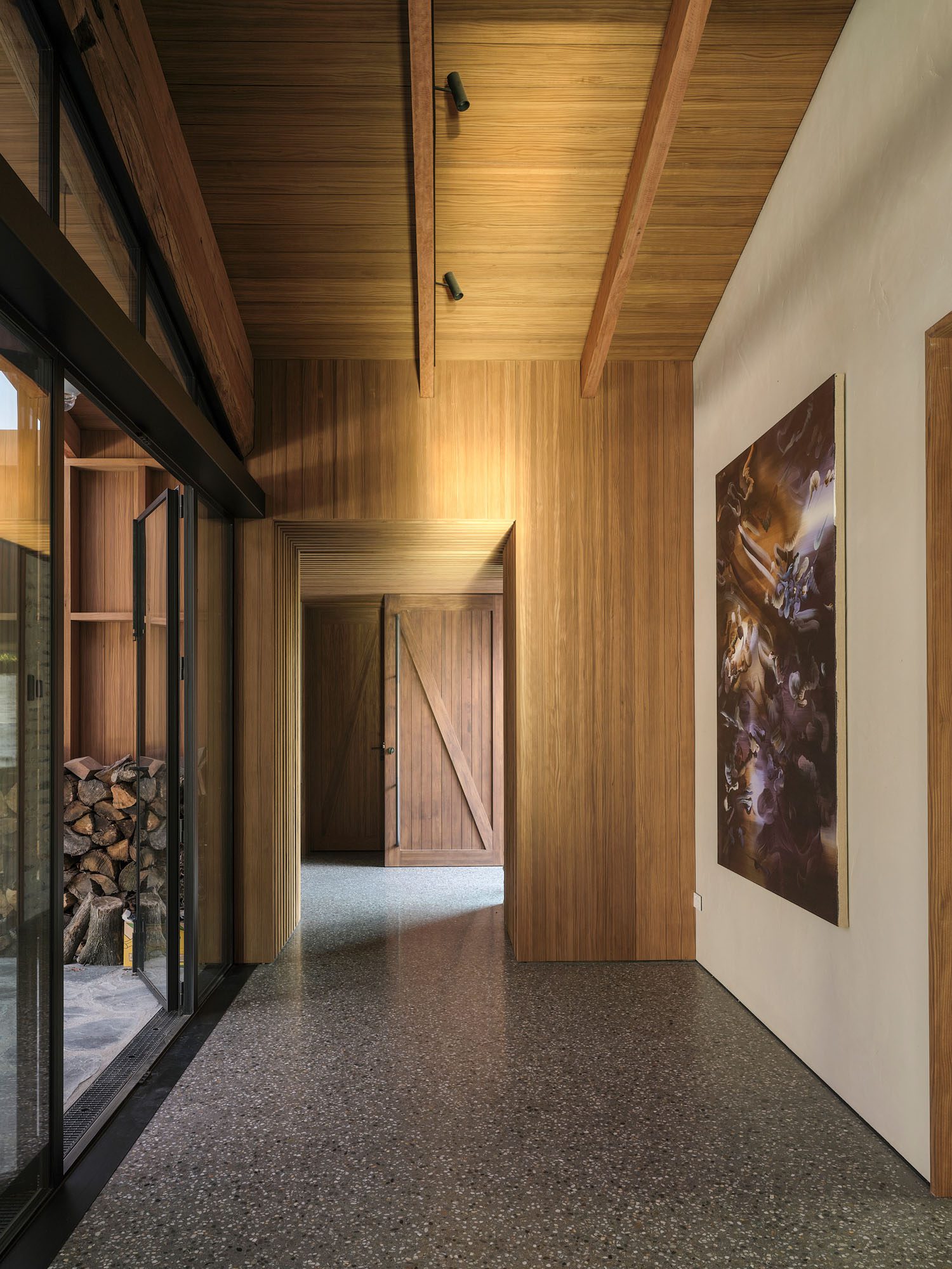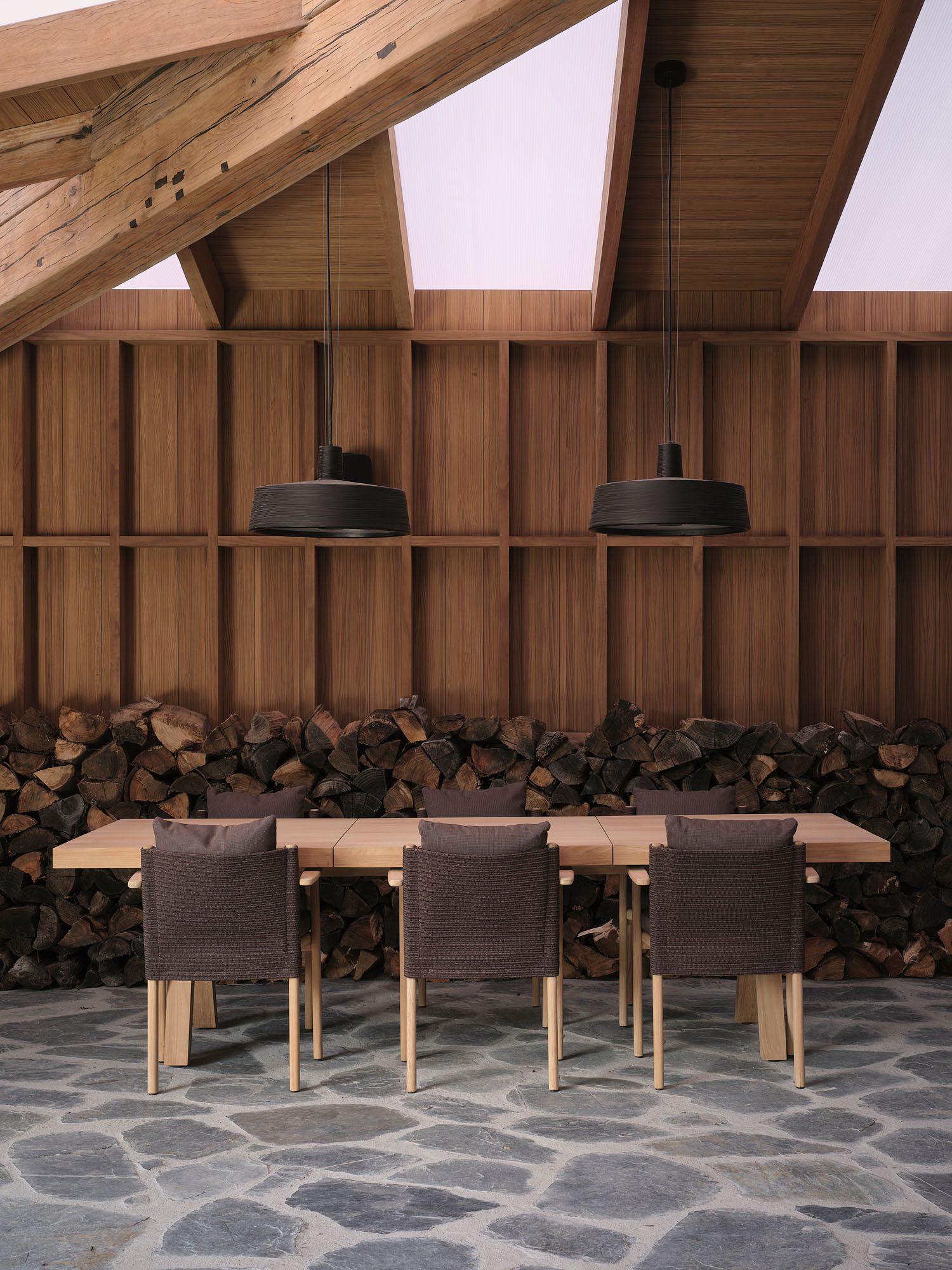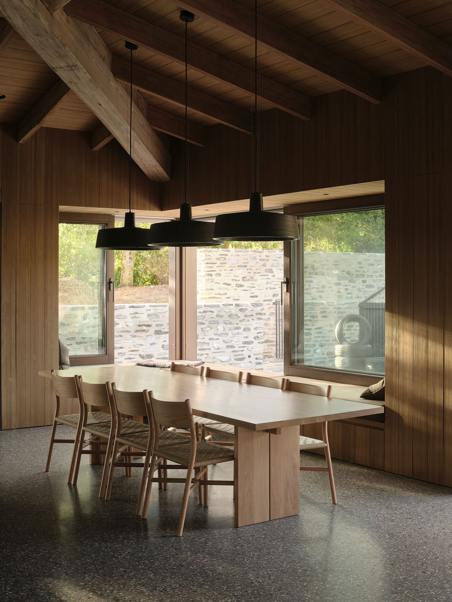 The latter is an impressive centrepiece to the house, acting both as an internal and external fireplace, a social hub, and a structural anchor that holds the large timber beams in place.