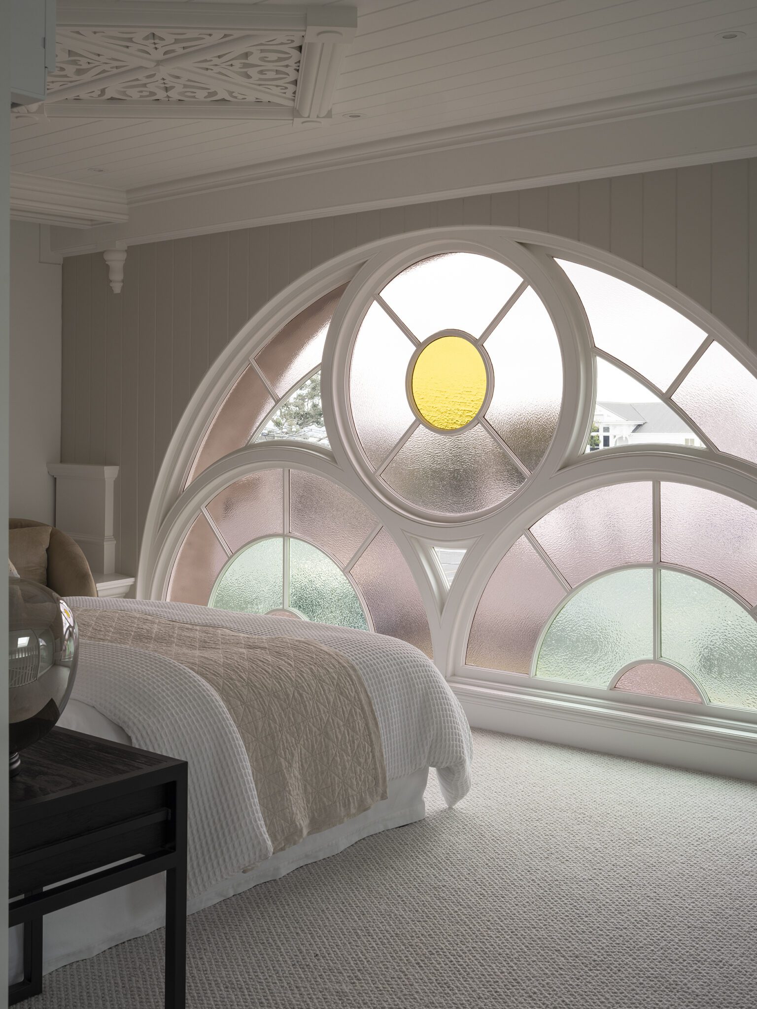 In one apartment, the primary bedroom is anchored by a north-facing rose window, washing the space in shifting colour as the day unfolds. Elsewhere, an intricate stained glass panel hovers above a dining space, a dramatic reminder of the building’s former life.
