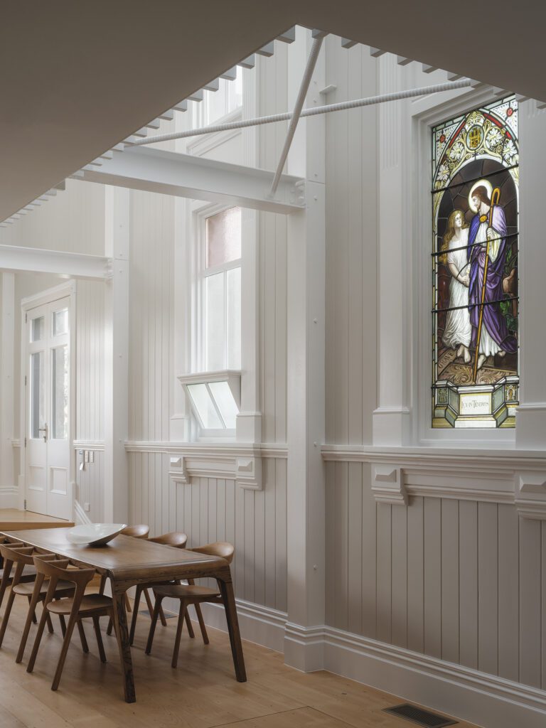Each apartment has two external walls — an unusual luxury in apartment living — allowing the architecture’s most evocative features to shine. Vast stained glass windows are fully restored, while externally the masonry façade has been carefully repaired. Timbers salvaged from the original sloping floors and roof sarking have been repurposed for new floors and stairs, and throughout the apartments, original decorative elements — including ceiling roses — have been meticulously reinstated.