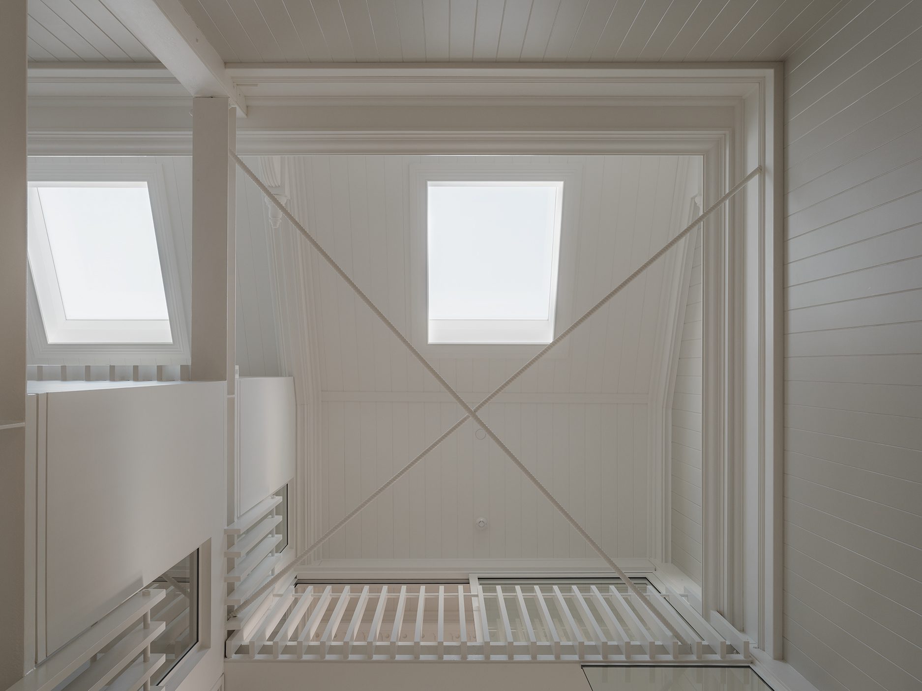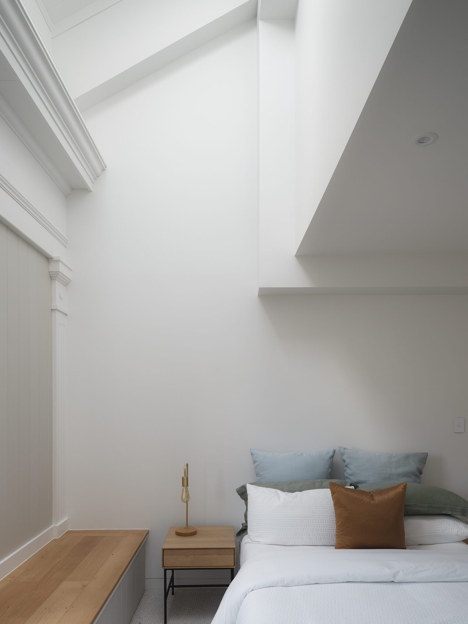Unsurprisingly, the original interior presented as a cold, damp, and dark void. Introducing warmth, light, and air without compromising the protected elements became central to the design response. “We couldn’t alter the windows,” Graeme explains, “so instead we introduced oversized skylights, drawing natural light down through a triple-height atrium and into every level of the building.”