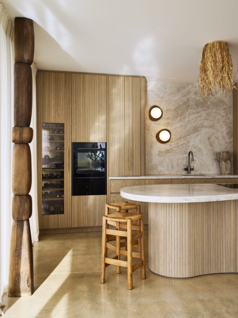 In response to the angular architectural envelope, it was essential that all interior design elements and details would take on natural, organic forms — a nod to the driftwood, rock formations, sand, and shell shapes in view from the site. “We used a warm, sandy-toned coloured concrete [PeterFell 162] for the floors, which initiated our biophilic design journey, and created a magical connection to the sandy bay.”