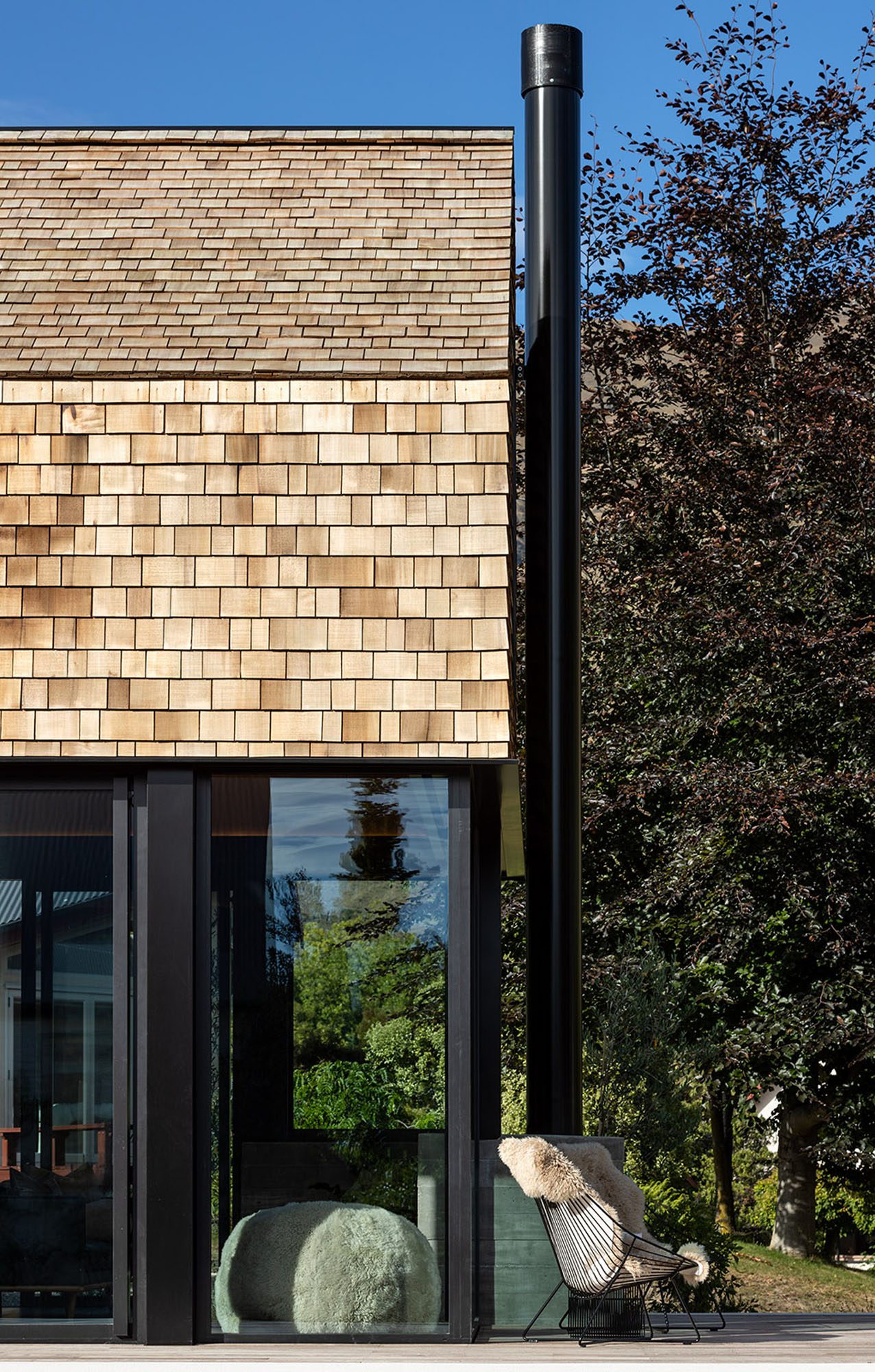 The first thing that captures one’s attention about this home is the carapace of cedar shingles that adorn three of its four sides. There are hundreds of them, side by side, acting like some sort of abstract mosaic. Some are darker than others, some have a patina of vertical or round lines while the irregularity of their horizontal lengths gives the whole thing a hand-crafted rusticity.