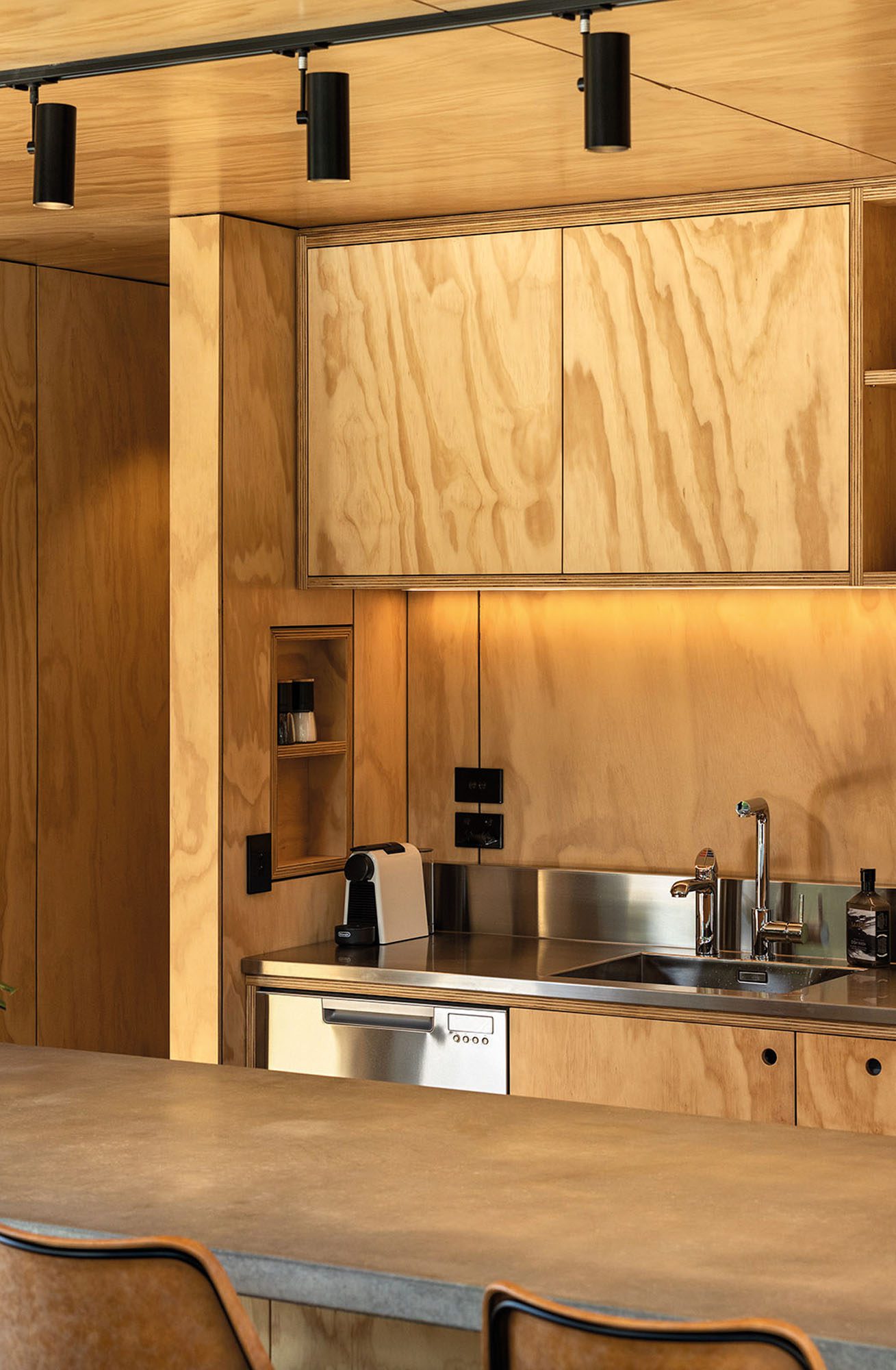 Once inside, a simple kitchen area feels expansive because of the double height, while the mezzanine level above allows for air and light flow.