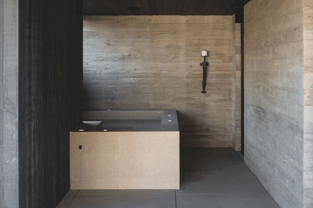 Shifting in tone, it accentuates the interplay of vertical and horizontal planes, converging expressively in a spa alcove formed by the cantilevered upper story. Here, there’s a moody allure; the space feels sheltered, tactile, and utterly immersive.