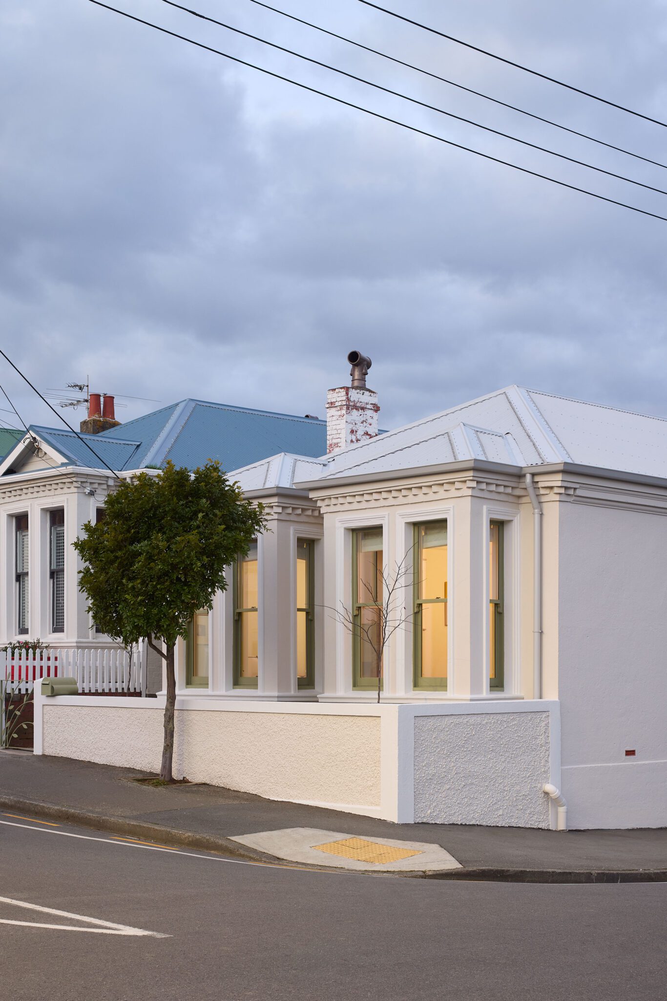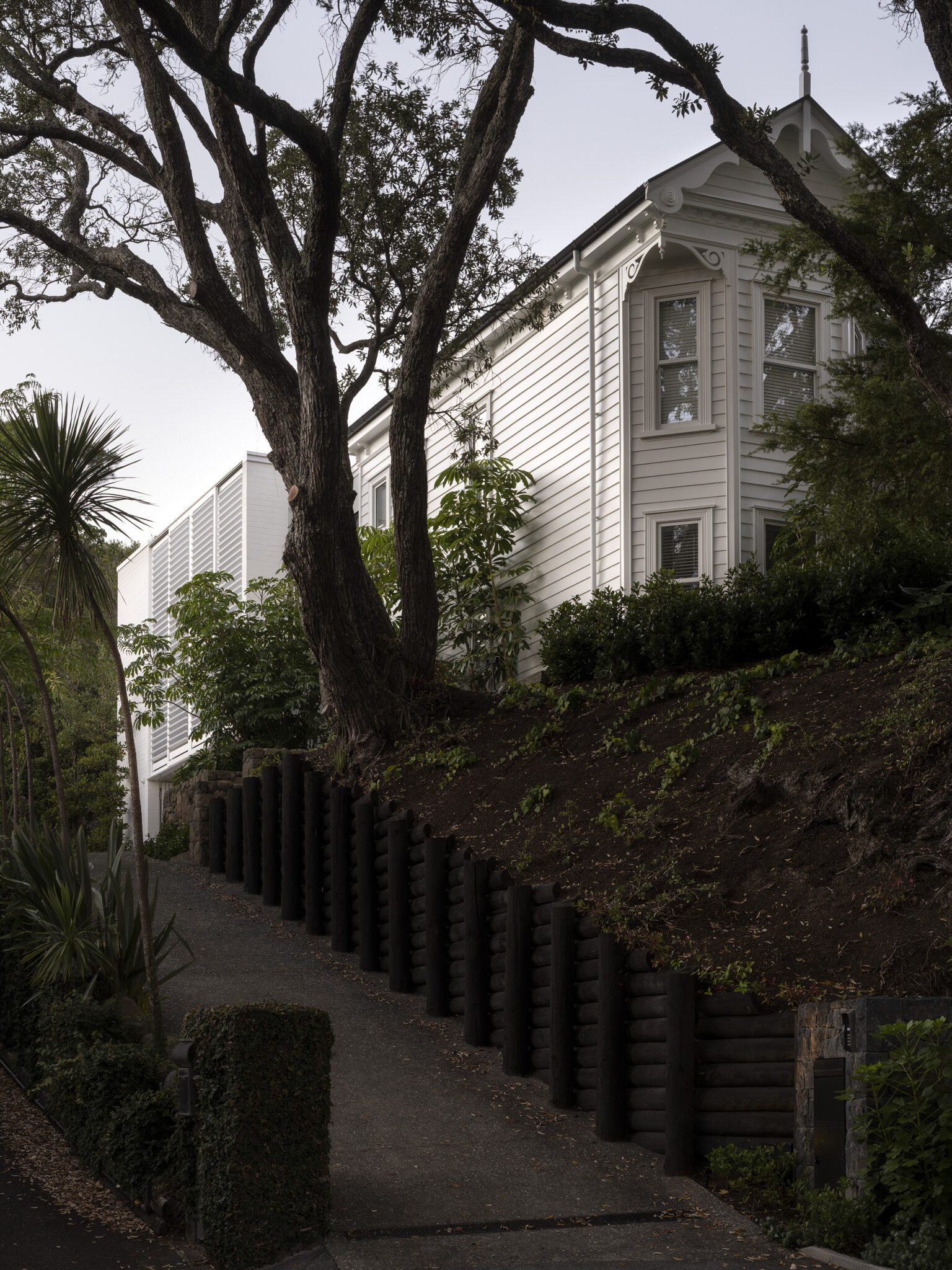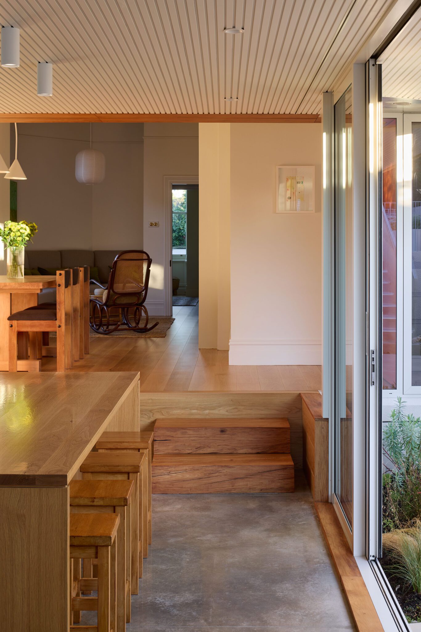 A new entry positioned between the heritage villa and rear addition unlocked the potential of this project.A clear separation of old and new is expressed through material choice and architectural detail.The two-storey addition creates a lofty, open-plan living space with a contemplative quality, seamlessly extending to a terraced garden through elegant giant steel doors.A north-facing deck edges the living area, its louvered screen wall providing privacy from the densely populated slope beyond. Meticulous detailing across both renovation and addition creates a rich dialogue between past and present.