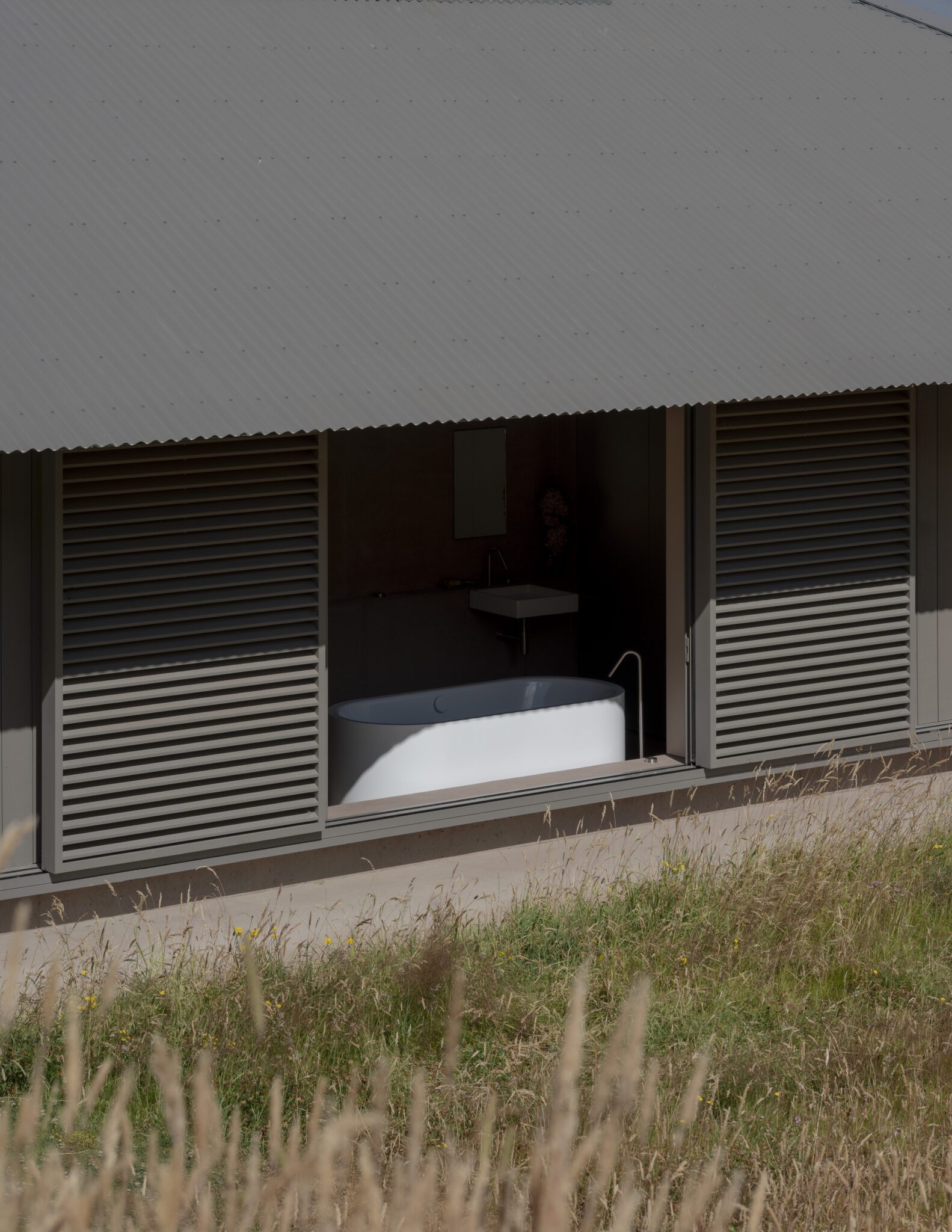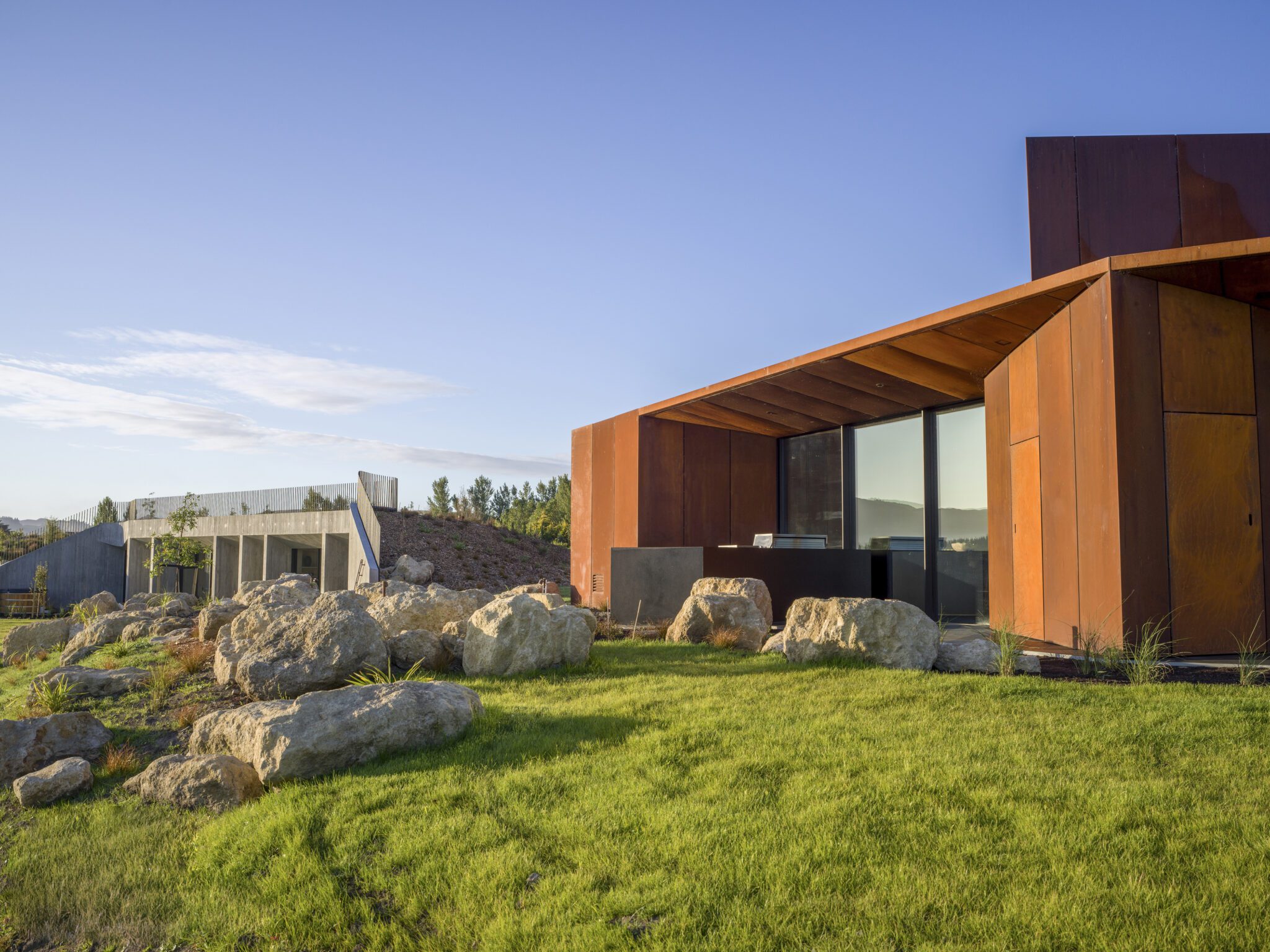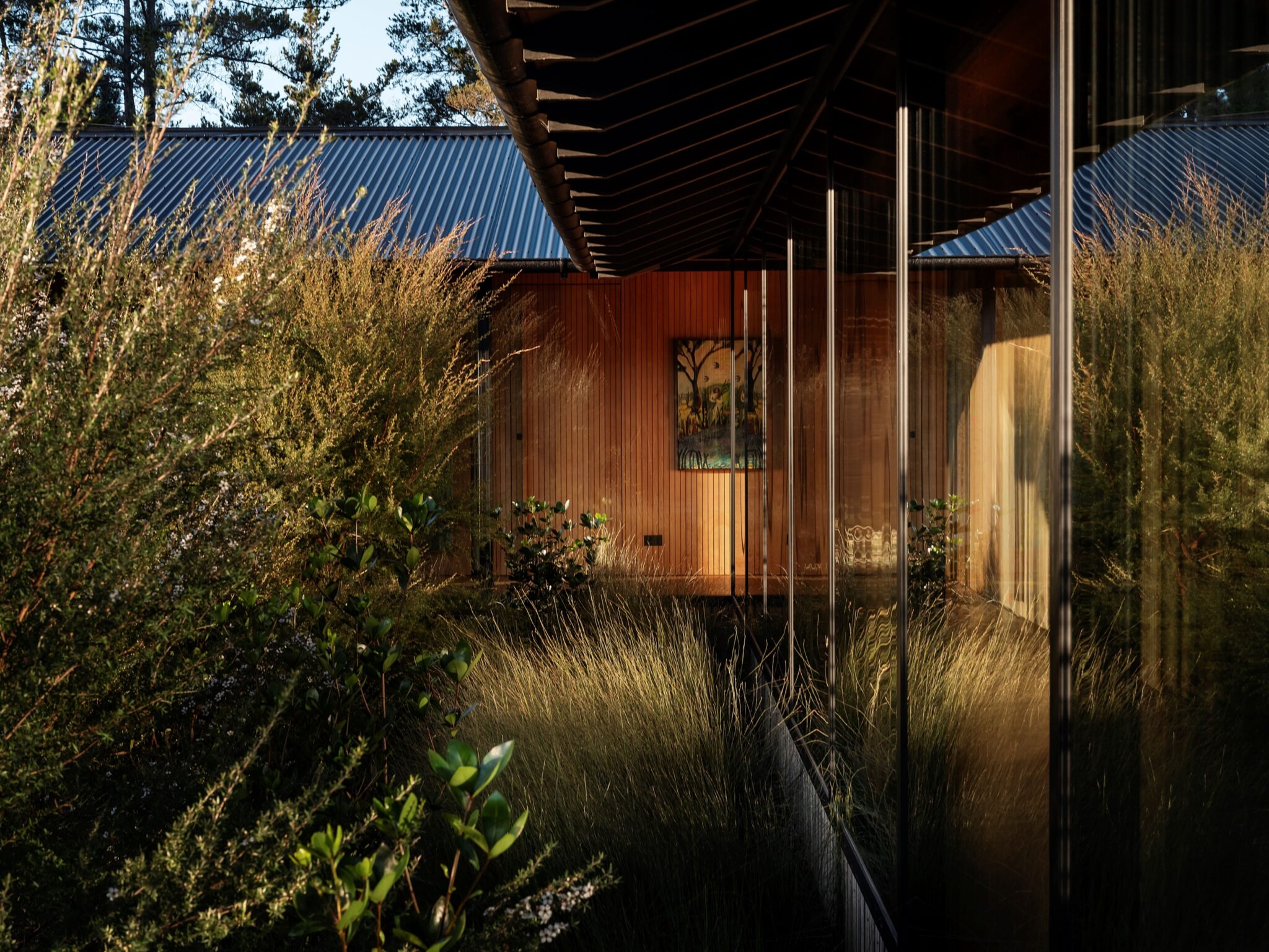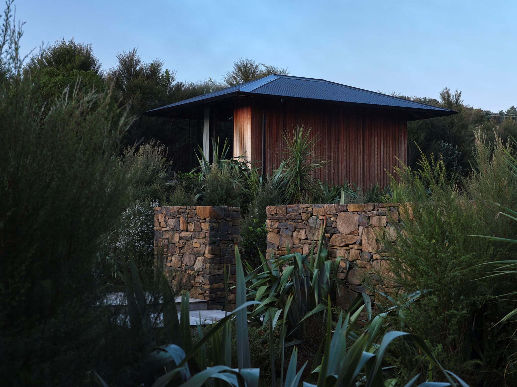 Conceived as an ‘anti-house’, this project challenges convention through three buildings dispersed across the site. The pivotal social pavilion is extroverted and sculptural, its pinwheel of apertures frame and connecting with the landscape. Clad in patinaed weathering steel, it encloses a luxuriously detailed interior of dark timber, stone, and angled planes that create dynamic spatial experiences. In contrast, two semi-buried bedroom sanctuaries are recessive and serpentine, their off-shutter concrete and light-toned interiors forming cocoon-like retreats. Idiosyncratic and assertive, the project redefines the retreat typology.