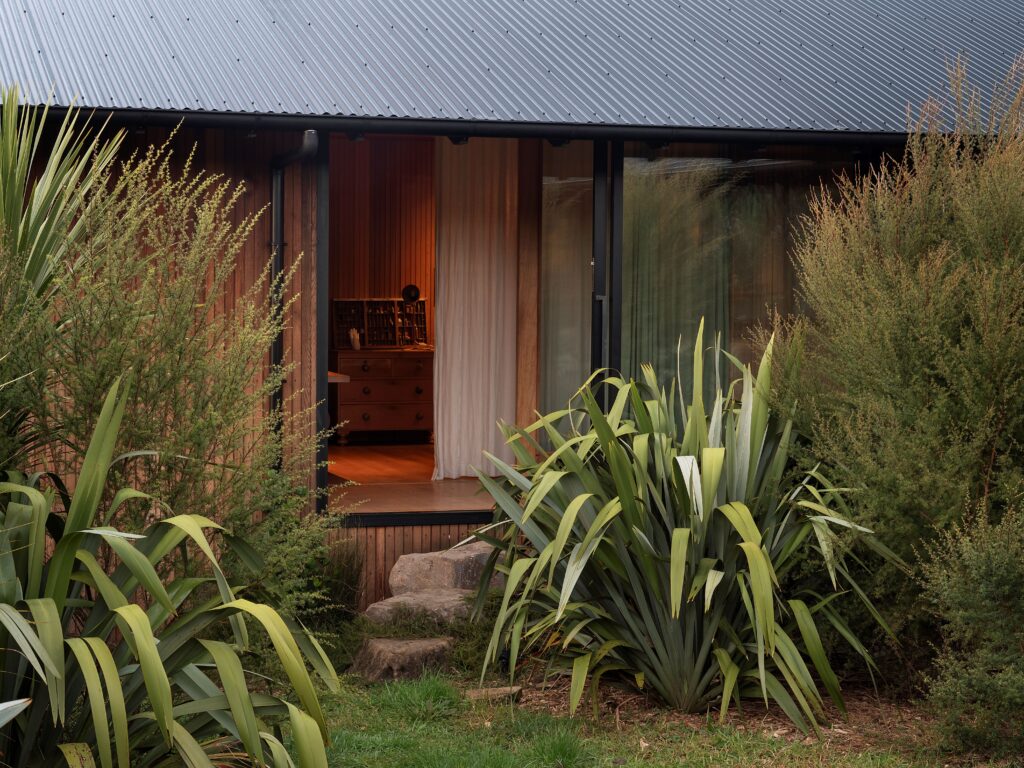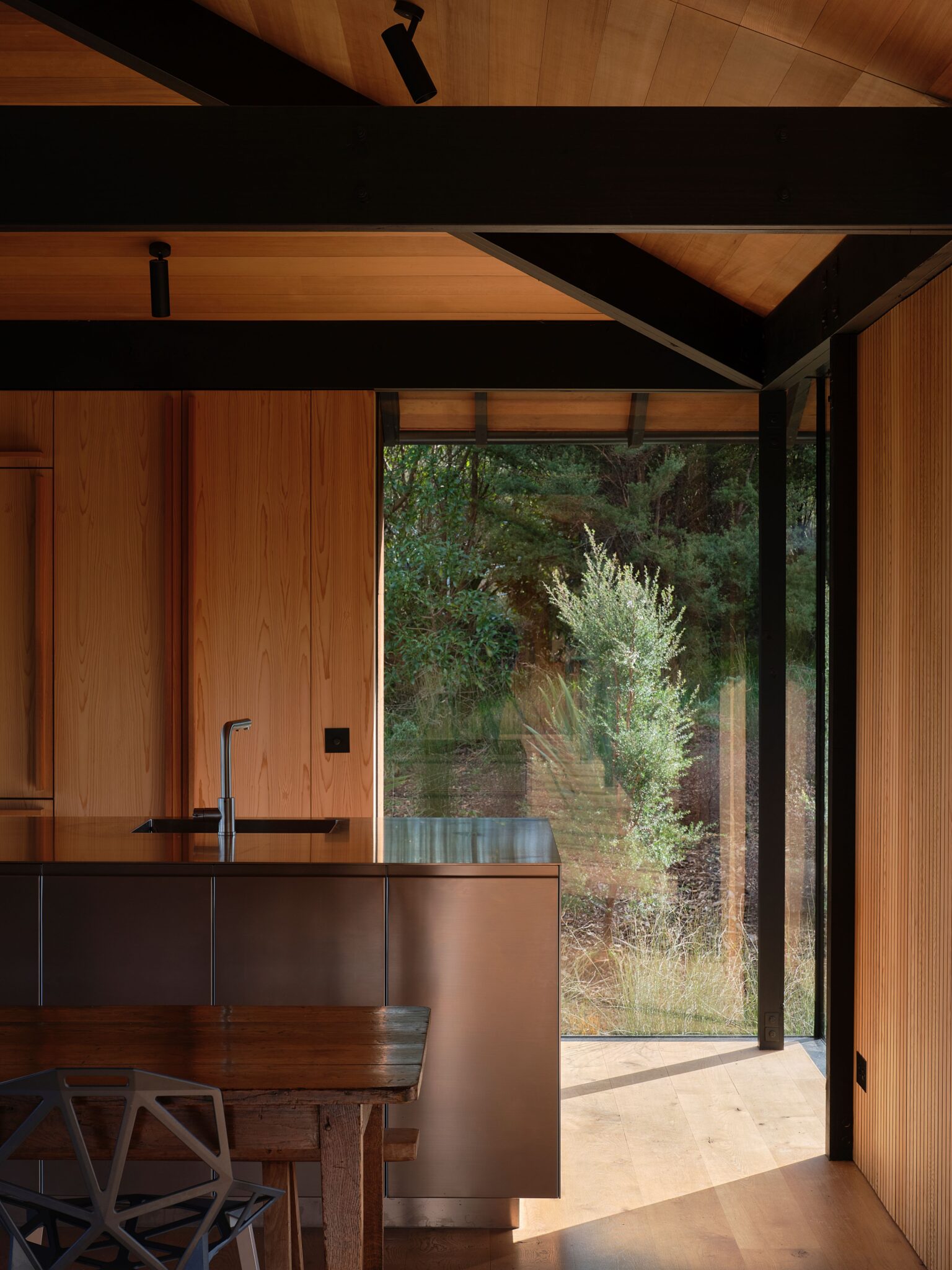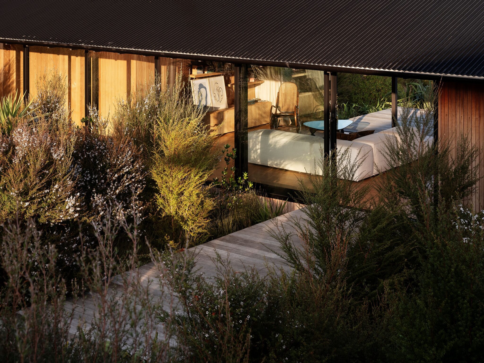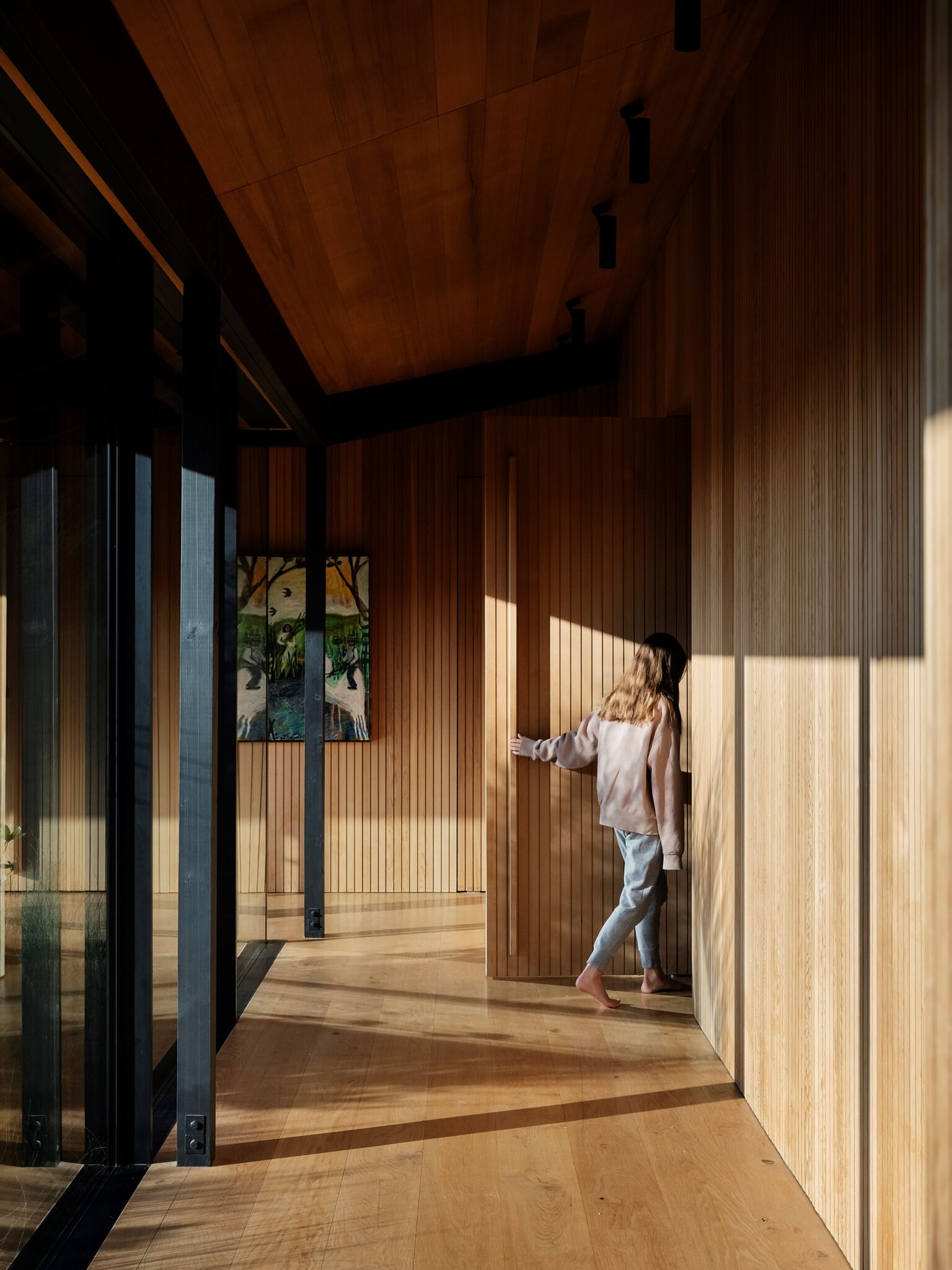 Conceived as an ‘anti-house’, this project challenges convention through three buildings dispersed across the site. The pivotal social pavilion is extroverted and sculptural, its pinwheel of apertures frame and connecting with the landscape. Clad in patinaed weathering steel, it encloses a luxuriously detailed interior of dark timber, stone, and angled planes that create dynamic spatial experiences. In contrast, two semi-buried bedroom sanctuaries are recessive and serpentine, their off-shutter concrete and light-toned interiors forming cocoon-like retreats. Idiosyncratic and assertive, the project redefines the retreat typology.