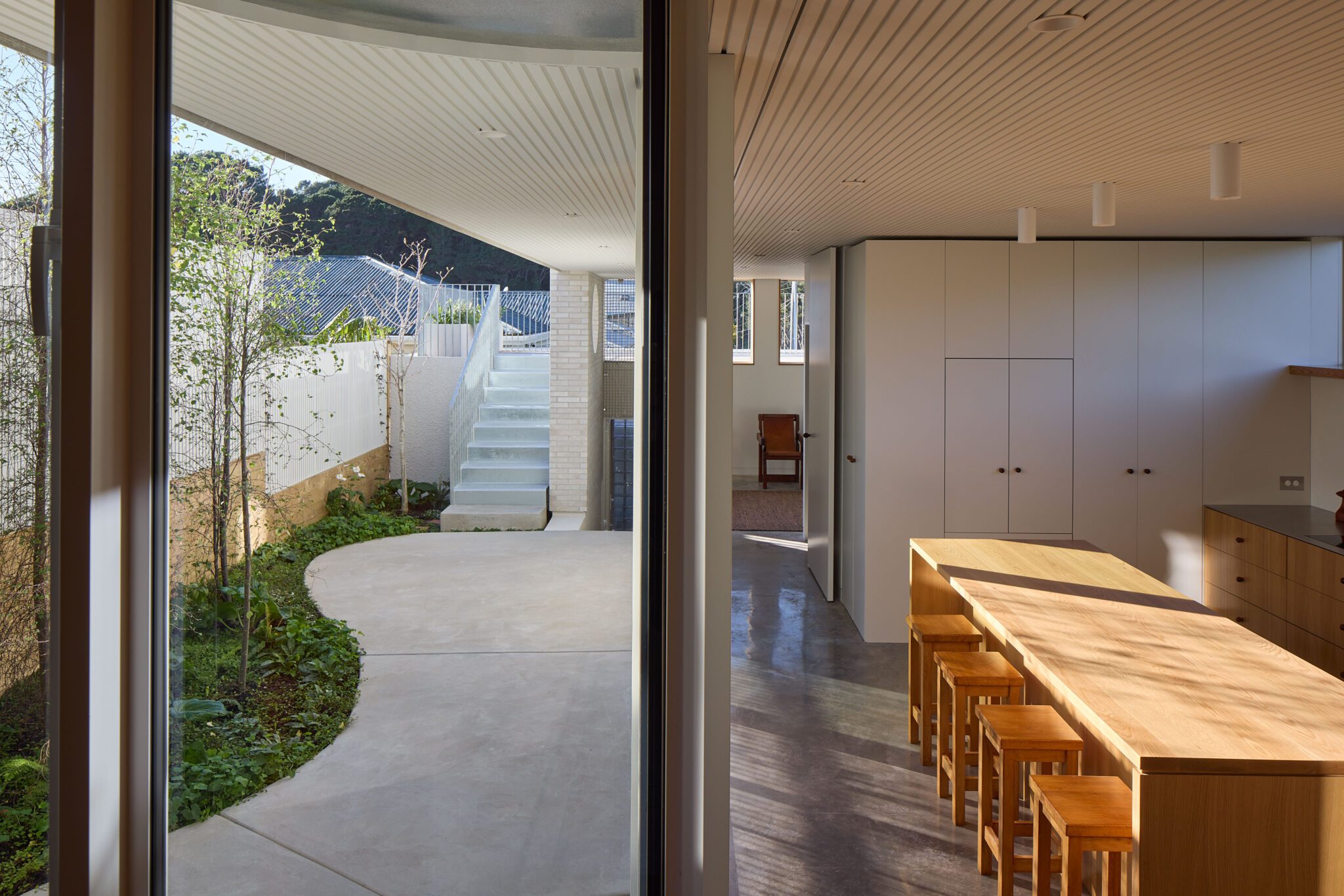 This new addition to one of the “Five Sisters’ Houses” located in Rintoul Street successfully integrates the new with the old while maintaining the identity for each. The new addition engages with the perimeter of the site and provides a rare urban edge to the street in its suburban setting. The materials of the addition are carefully chosen to respect the concrete structure of the existing house, but equally create a juncture between the two with subtle brick coursework and a refined treatment of the openings. The new spaces are light-filled and delightfully engage with the contours of the site, providing an inventive solution to domestic living with a mix of new and old.