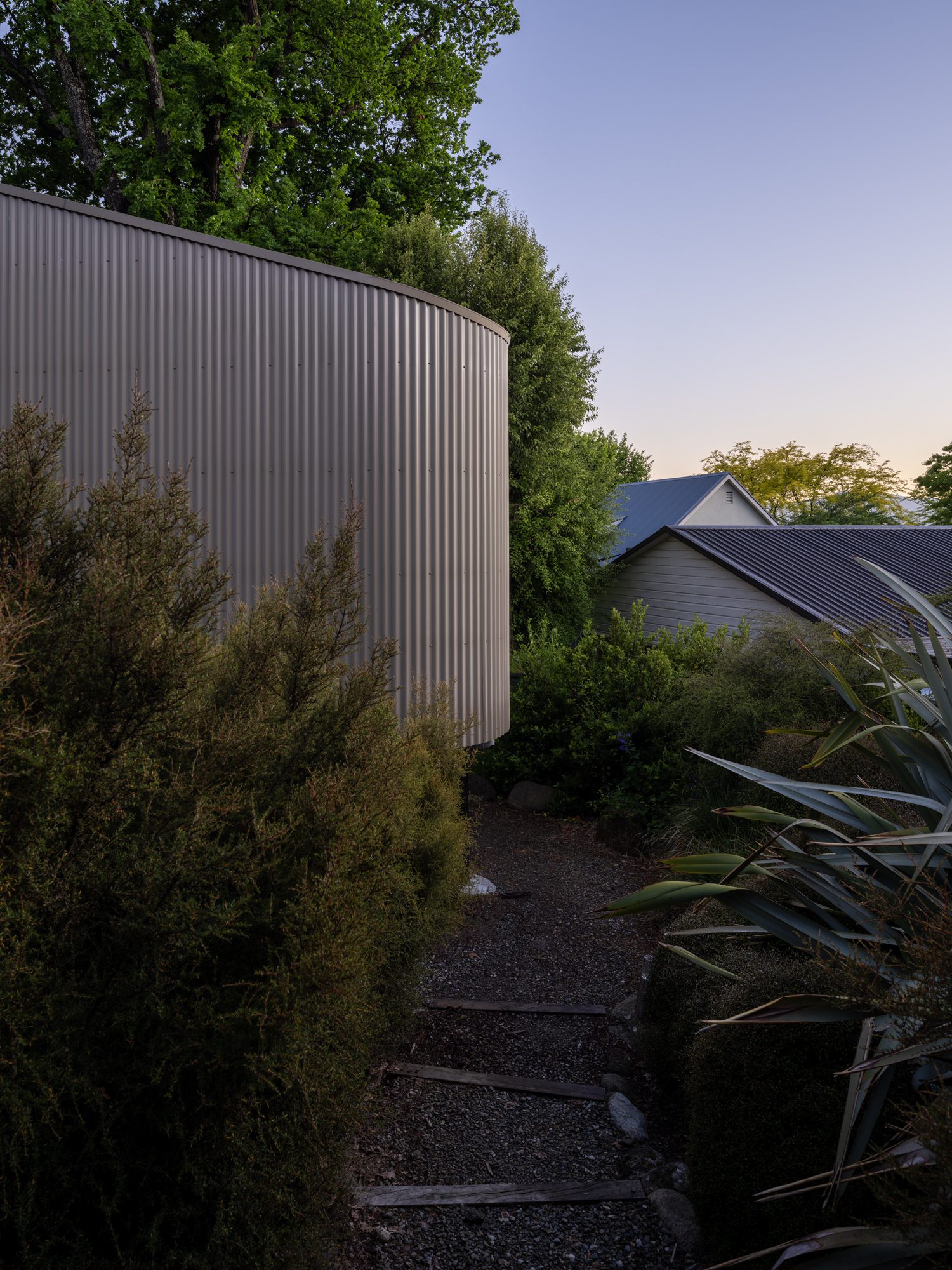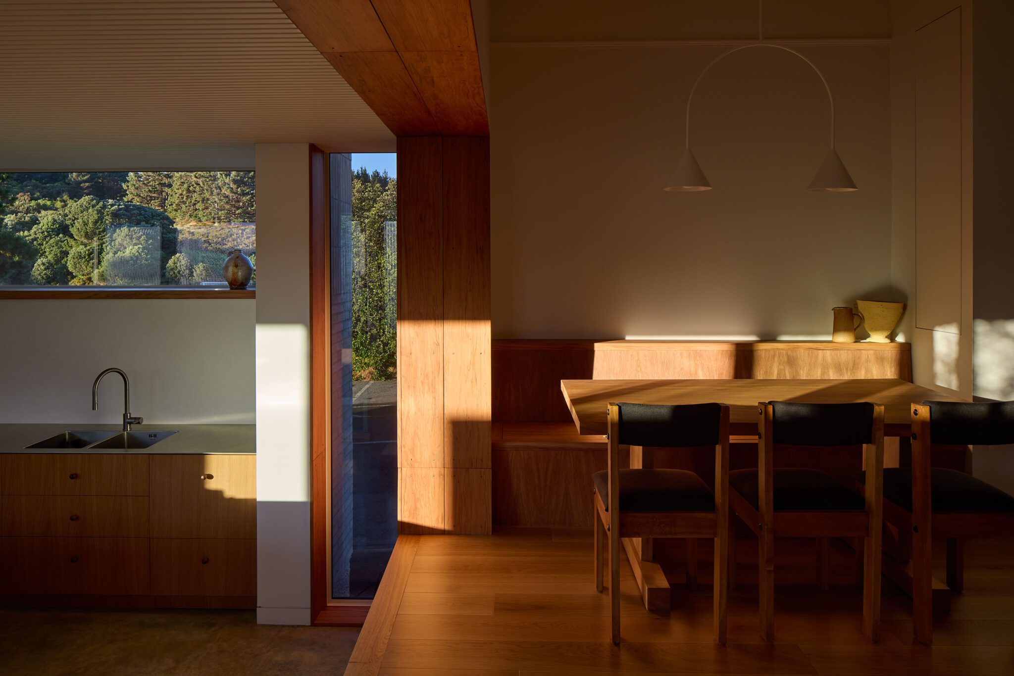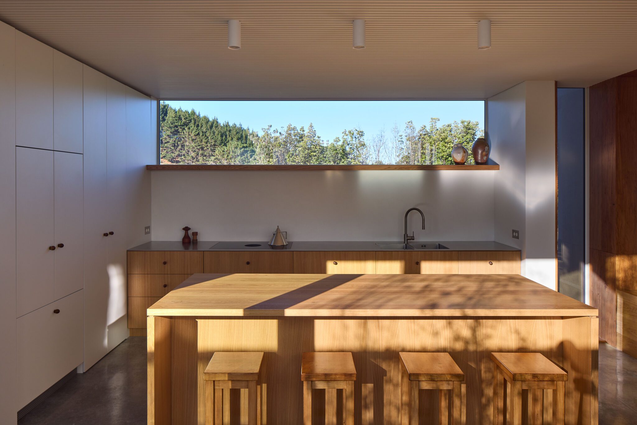 This house is a sensitive and understated insertion into its rural setting, with careful and extensive plantings that both ground the building and provide shelter. An L-shaped plan enables the house to adapt and respond to its environment, while the placement of a separate studio completes the notion of a courtyard, forming a sheltered and recessed outdoor space. Planning is rigorously organised on a 600mm grid aligned with rafter spacings, allowing for cost efficiency and a variety of spatial outcomes. Simple forms and a low-pitched roof with generous eaves create a modest scale and a thoughtful relationship to the landscape. Inside, the relaxed atmosphere is supported by detailed and crafted finishes, extending to the custom wardrobe doors and drawer pulls. The garage is acknowledged as a flexible, multi-functional space rather than one solely for cars, reflecting the pragmatic needs of family life. Together, these qualities produce a home of quiet character, accommodating the complexities of family living with clarity and care.