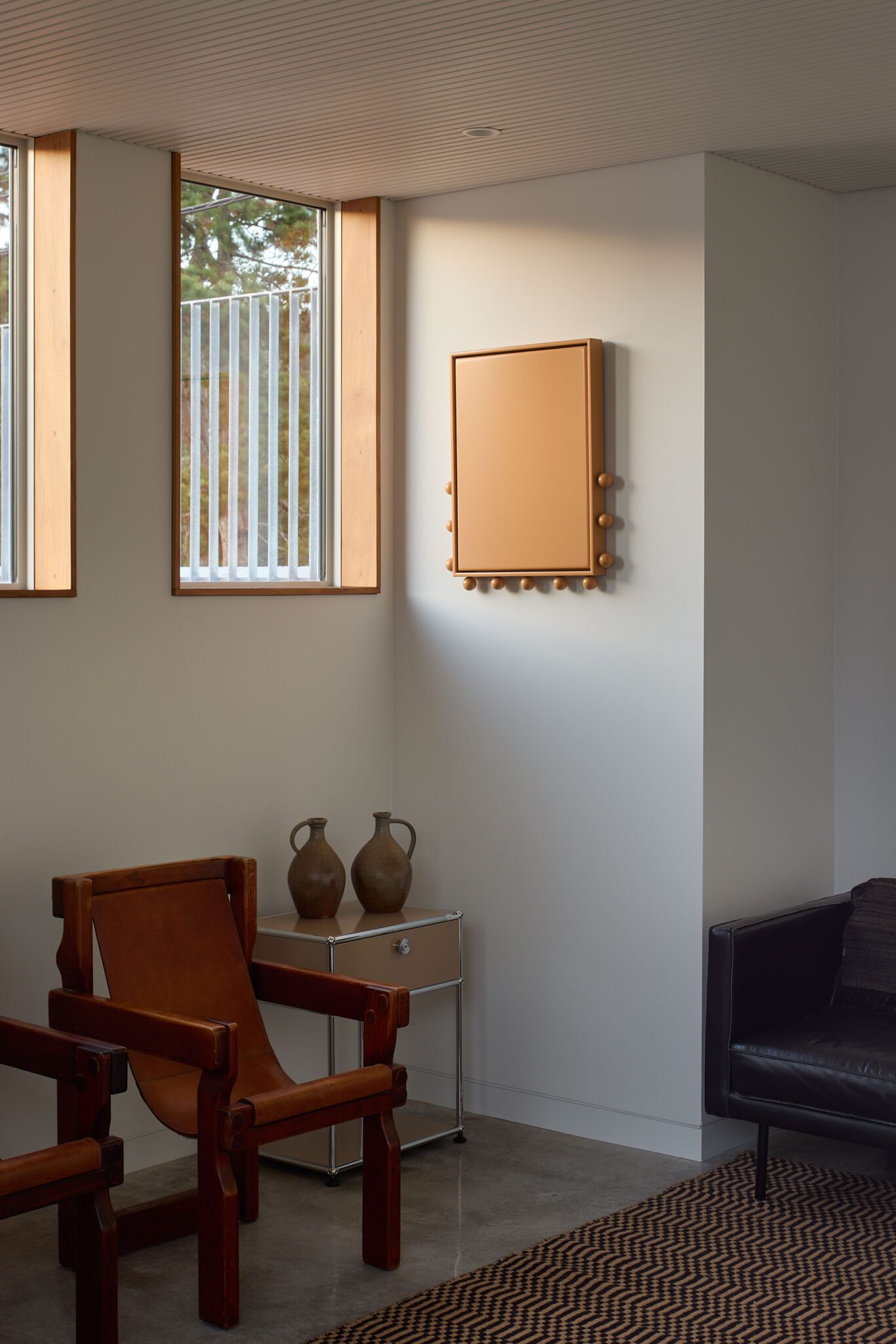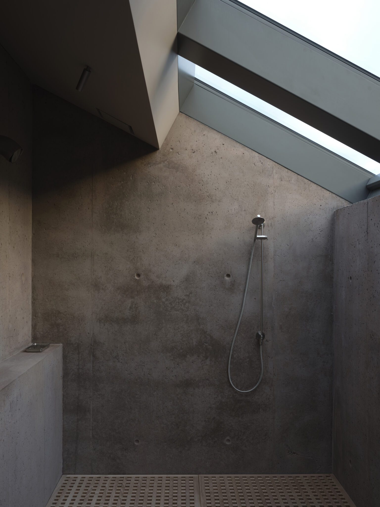 An elevated walkway with a storage hut replaces the garage, enriching the arrival sequence with dual purpose. A simple box showcases efficient planning, innovative materials, and the clarity of their application. Roof lights and generous apertures extend the interiors into the surrounding treescape, while the house both hovers above the forest floor and anchors itself on a raised terrace. Modest in scale, the project demonstrates the significant impact architects can deliver within tight constraints.