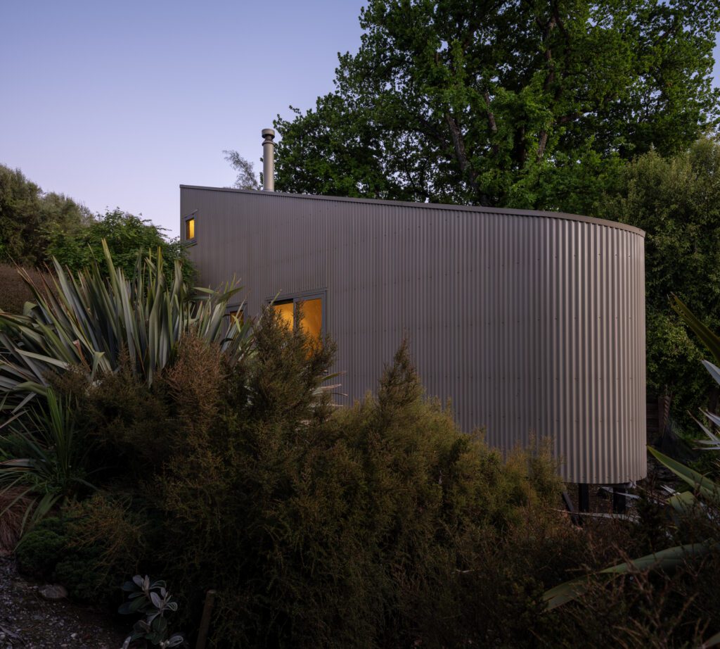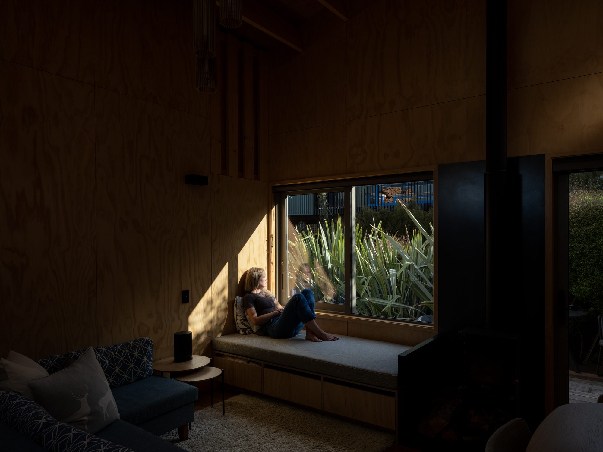 Completing the second stage of a two-part holiday home development, this project cleverly capitalised on a shady, under utilised corner of the site. The compact, triangular 60-square-meter home positions itself as a landscape element within an established native garden. The form follows the sloping topography, gently stepping down while its curved corners soften its presence on site and relationship with the existing dwelling.Openings are thoughtfully placed to frame views, and skylights bring an abundance of natural light into the space while maintaining privacy. Interior timber brings warmth, a sense of comfort, and resilience, where the exterior curved forms are echoed inside, enriching the experience of the building’s form. A bunk room loft, accessed by ladder, utilises the generous double-height space, extending the home’s capacity in a charming manner.