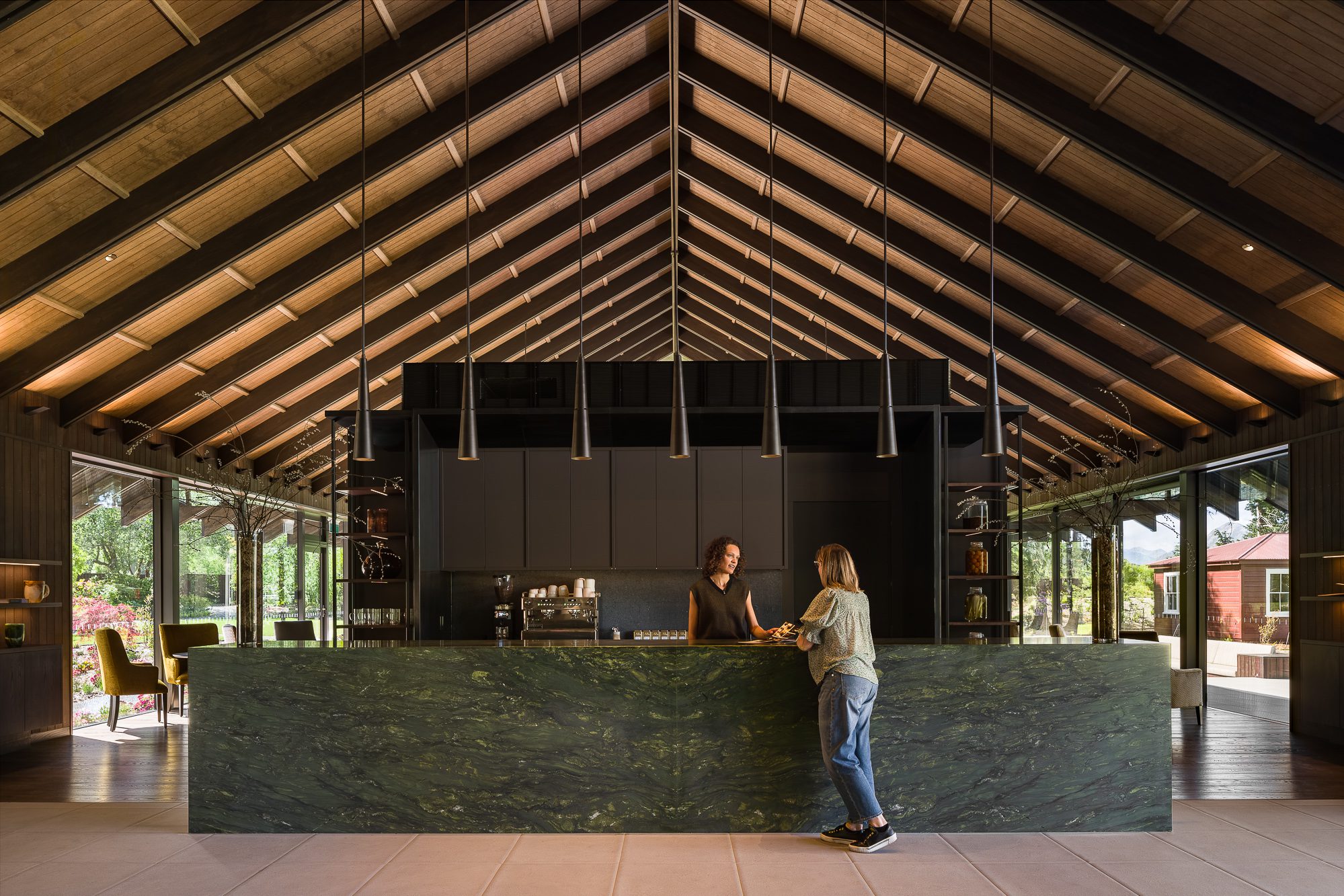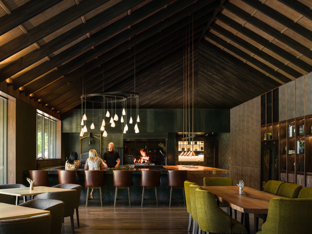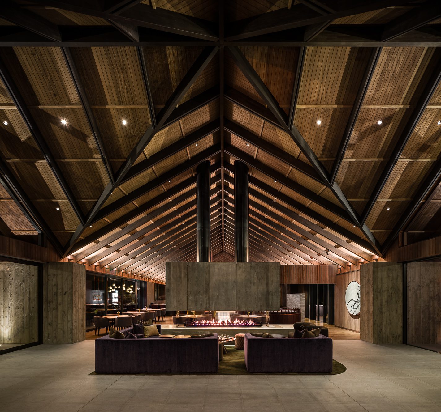 Set within a dramatic alpine landscape, this restaurant adopts a simple gable form with a strong cross axis, carefully oriented to frame views and nestled amongst the surrounding beech forest.Inside, a rich palette of natural materials evokes the atmosphere of a luxurious alpine lodge on a grand scale, while the exposed structure introduces arhythmic order and the warmth of natural timber. The arrival sequence is anchored by a spectacular central fireplace, creating a memorable focal point for guests. Every material choice is deliberate and refined, from robust timbers to intricate detailing, with a distinctive steampunk aesthetic brought to life at the chef’s table in the open kitchen. Underpinned by a rigorous grid where all proportions trace back to this foundational order, the design achieves a balance of grandeur, intimacy and precision. The result is an alpine dining experience that is both dramatic and immersive, celebrating place, craft and hospitality.