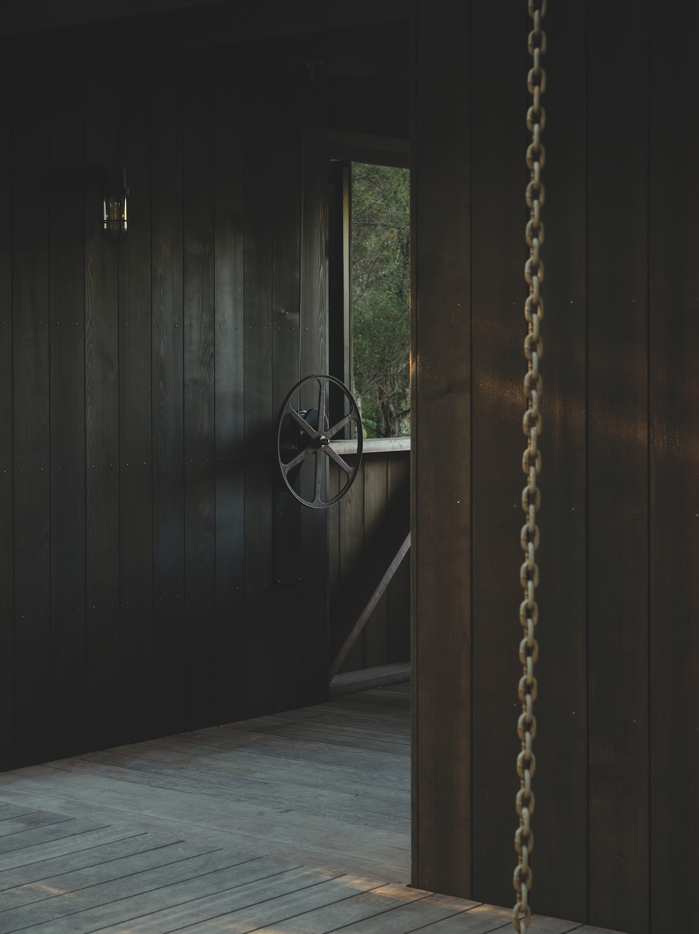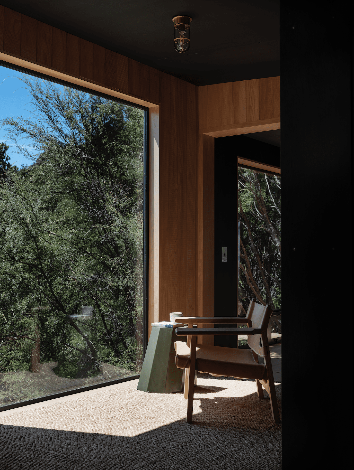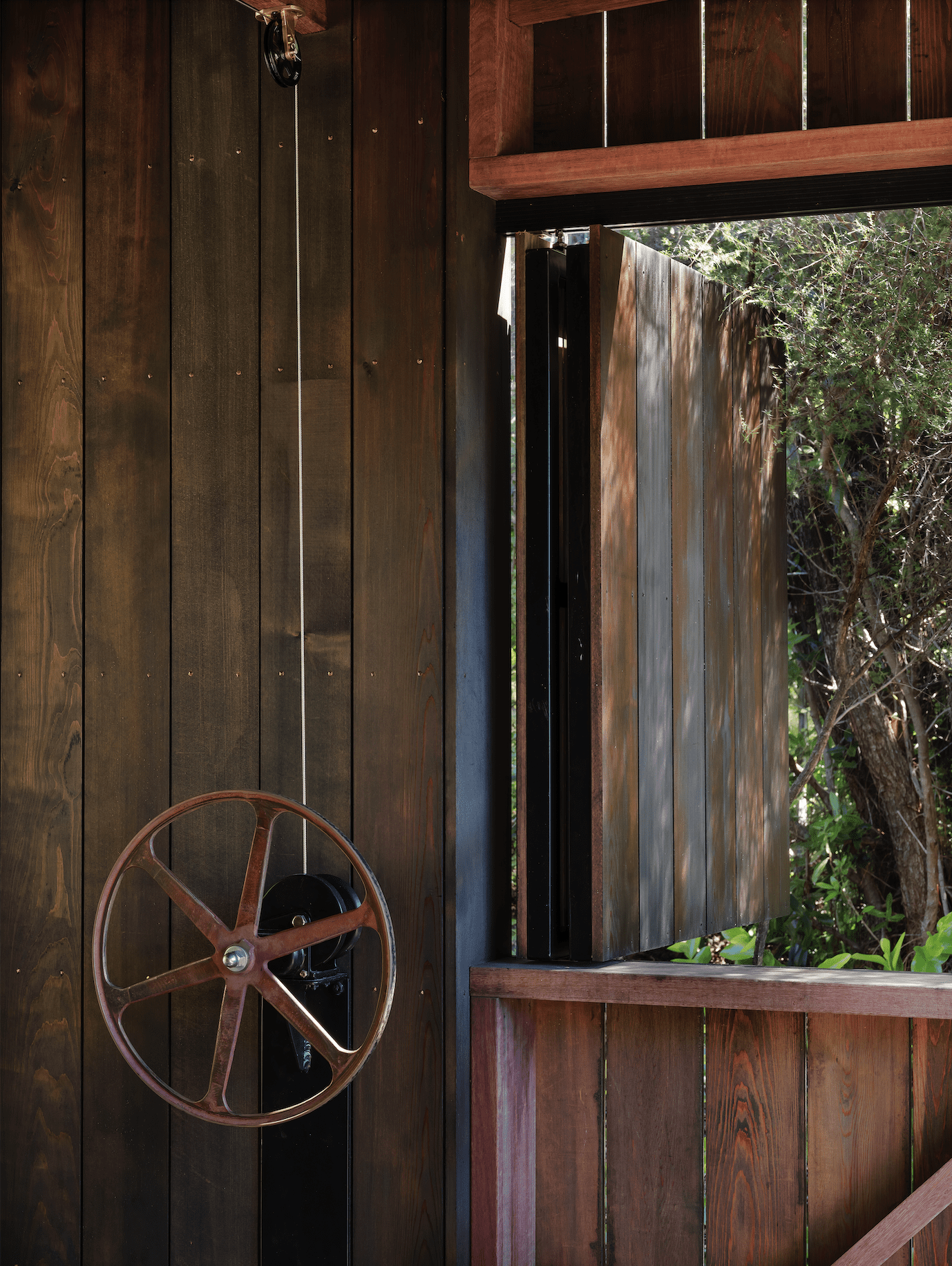 There are some quirks, too. The front door handle is a branch one of the owners found on the site and the architects had cast in bronze. A platform above the trees, with a steel parapet, sits at the top of the structure and provides the perfect spot for a morning coffee amid nature. A picture window can be opened via a vintage crank while, outside, a hefty chain takes the place of downpiping and directs rainwater collection on the site. All of these details conspire to create a multi-award-winning dwelling with a profound sense of joy.