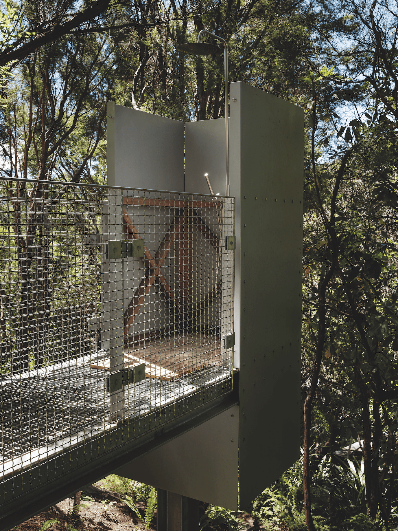 The completed 37m² retreat is enclosed, yet open to the elements. The concept of a traditional bathroom has been deconstructed, resulting in an outdoor shower with amazing views and a concrete toilet bunker that is accessed via the elements. The nest-like, timber-lined sleeping space and a bijoux living area have become a beloved destination that the owners retreat to, to sleep and relax.