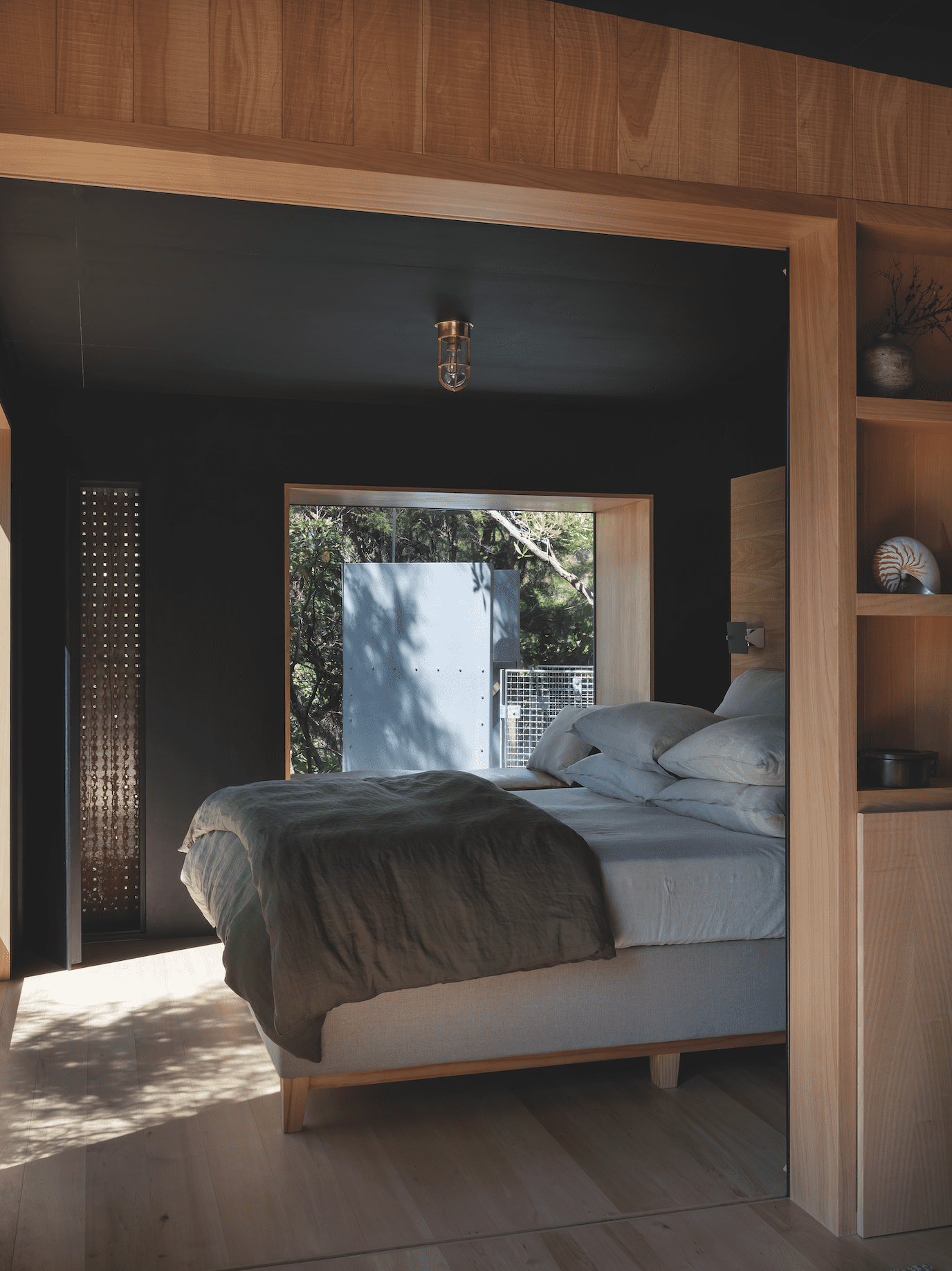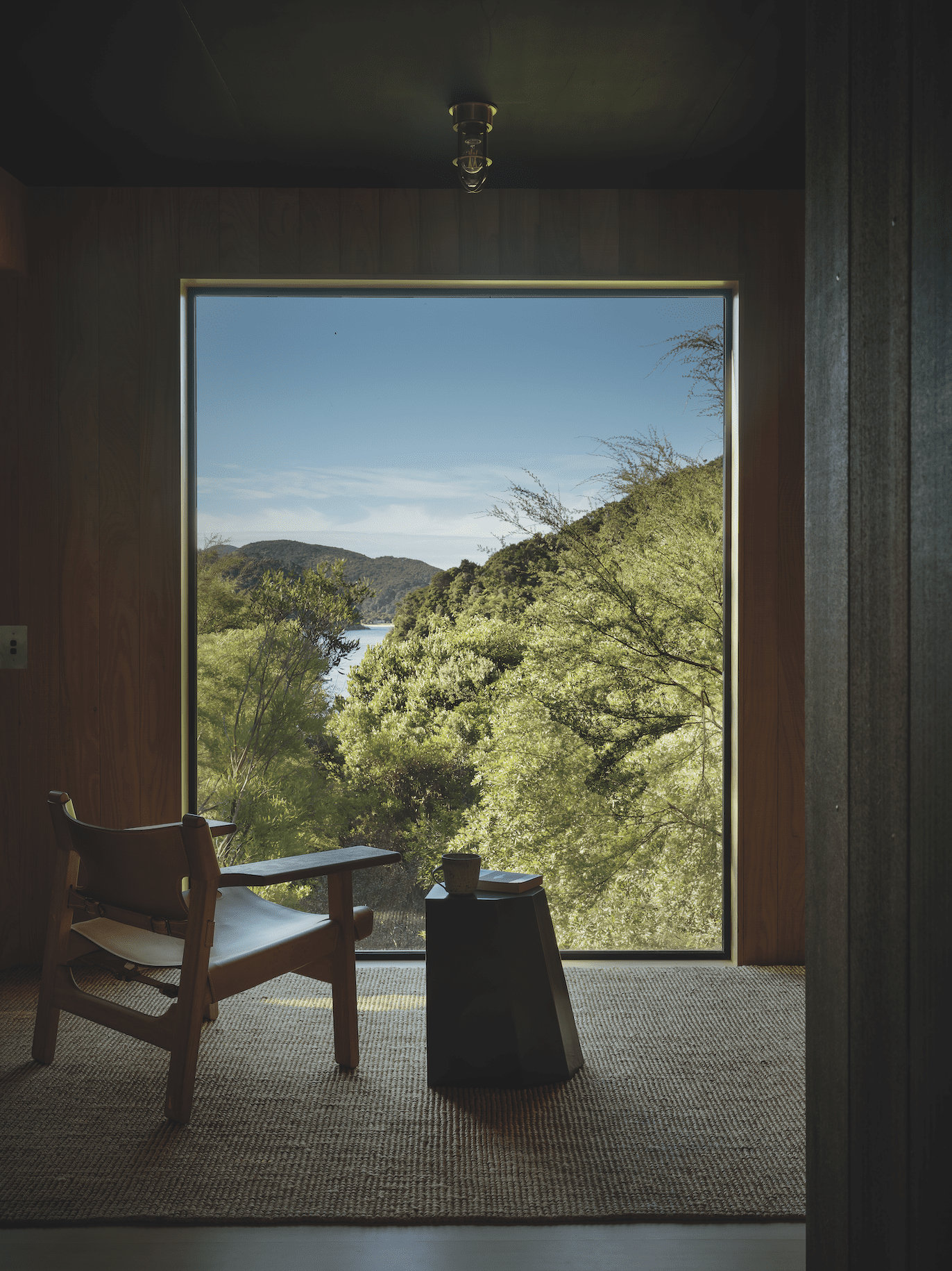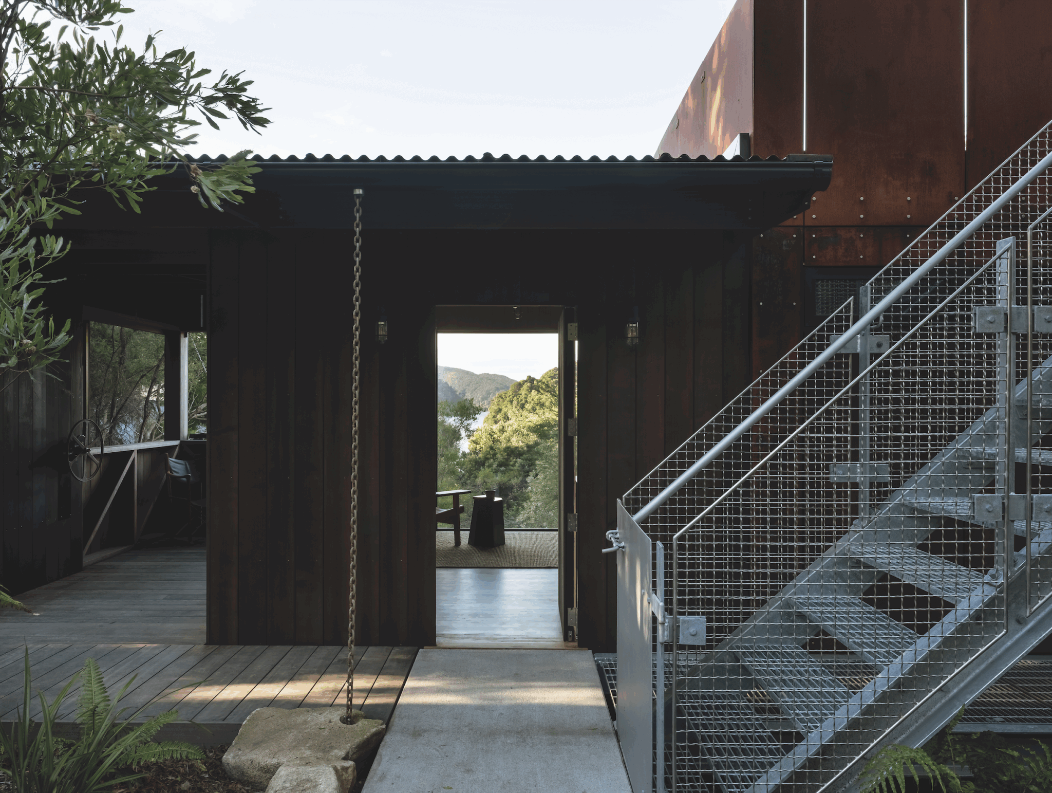 All the materials had to be ferried in by barge and then carried on foot up the hill. As a consequence, the one-bedroomed cabin sits on just six piles and features Corten steel panels, limestone and timber in quantities that were light enough to carry. “It had to be really considered,” says Prue. “There was nothing we didn’t scrutinise or contemplate: how it was going to be used; how to store it once it was in there. It was a luxury to consider every detail and make purposeful decisions, which led to a calm, crafted space.”