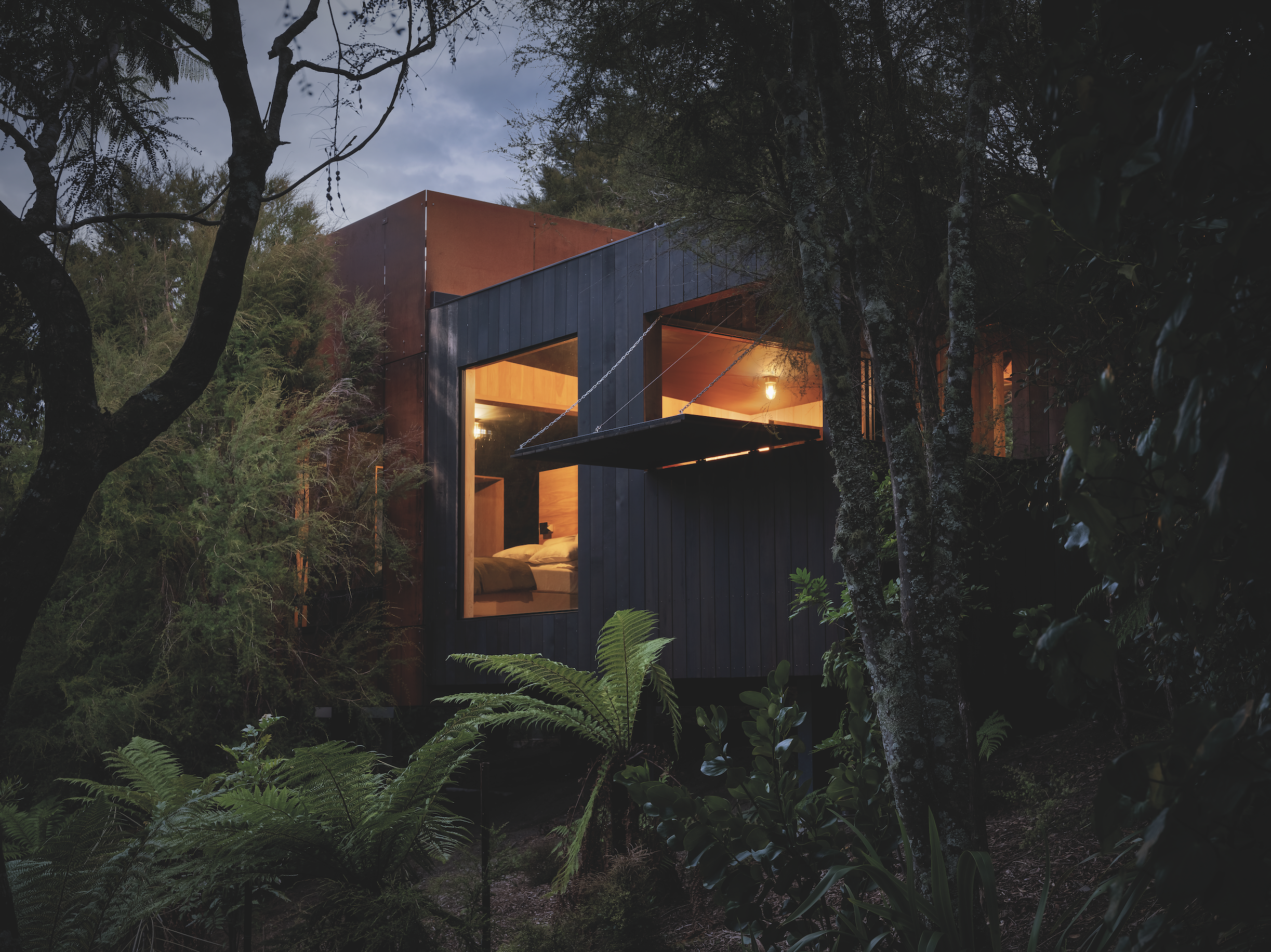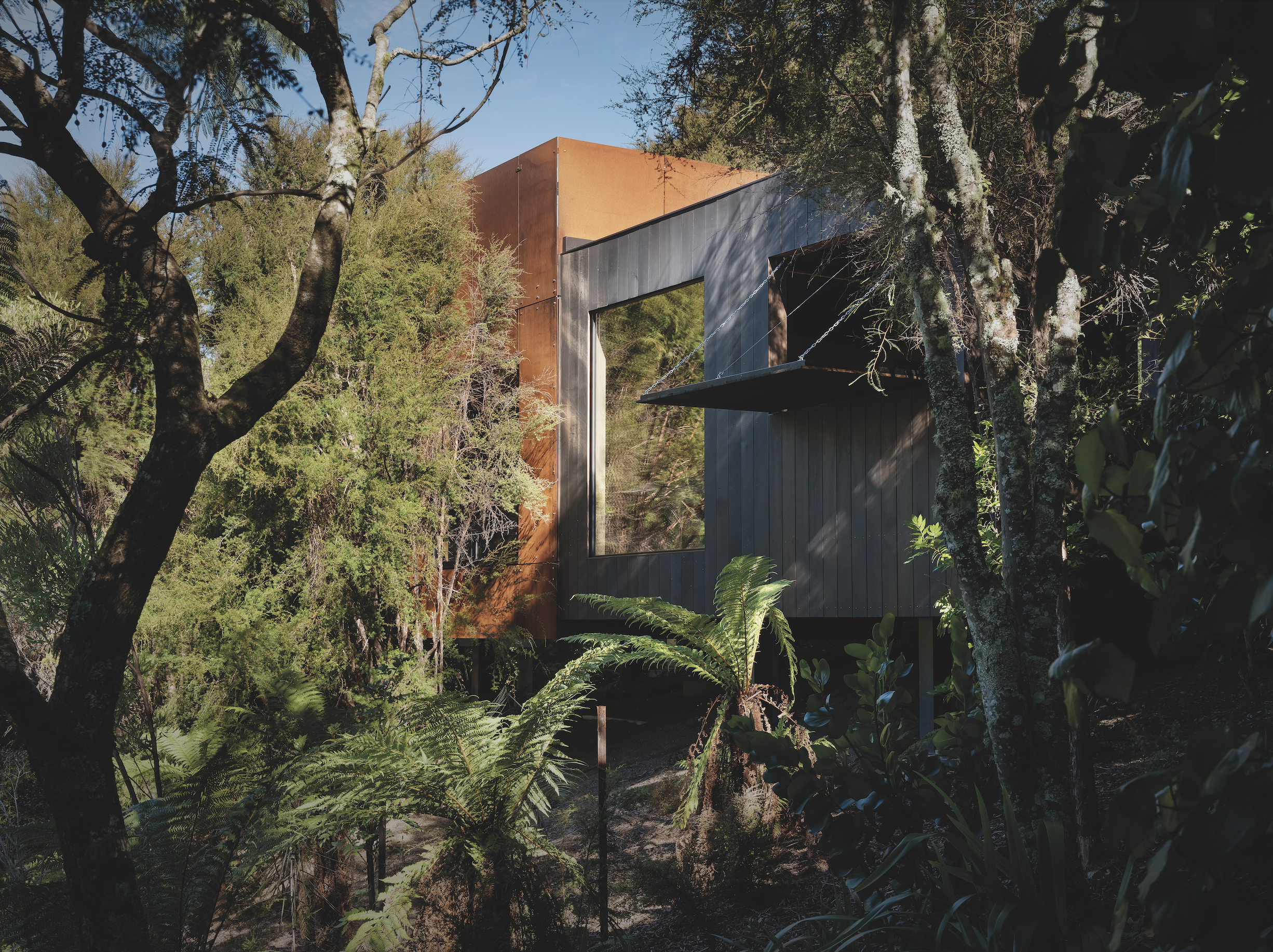 Prue Johnstone and Mike Callaghan of Johnstone Callaghan Architects were determined to minimise the impact of the cabin on the bush-clad site, to ensure as few trees as possible were disturbed in the construction process. The structure also had to disappear into the bush, rather than stand out, and make visitors feel cocooned in the flora and fauna of the surrounding whenua.
