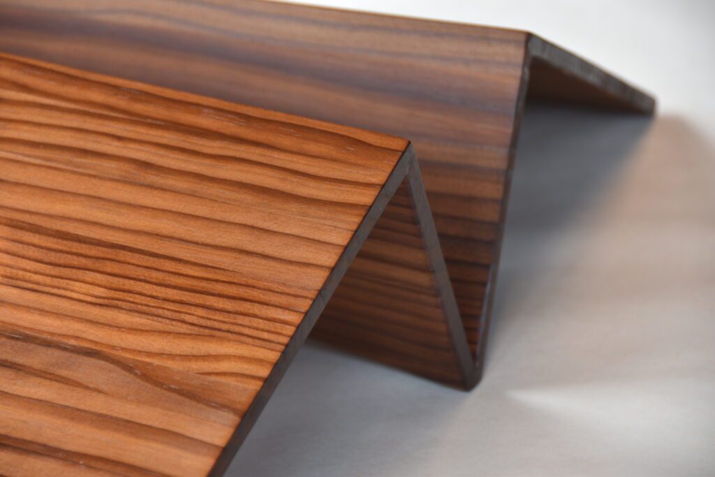 Since that first piece, Mark has continued to refine the process, now working with local supplier Abodo to utilise offcuts generated during the production of their thermally modified timber. These narrow tongue-and-groove ‘shorts’ become the starting point for each piece. The edges are removed to create squared boards, which are then laminated to form larger panels. From there, geometry takes over: edges are mitred to precise angles, wing planes shaped into triangular forms.