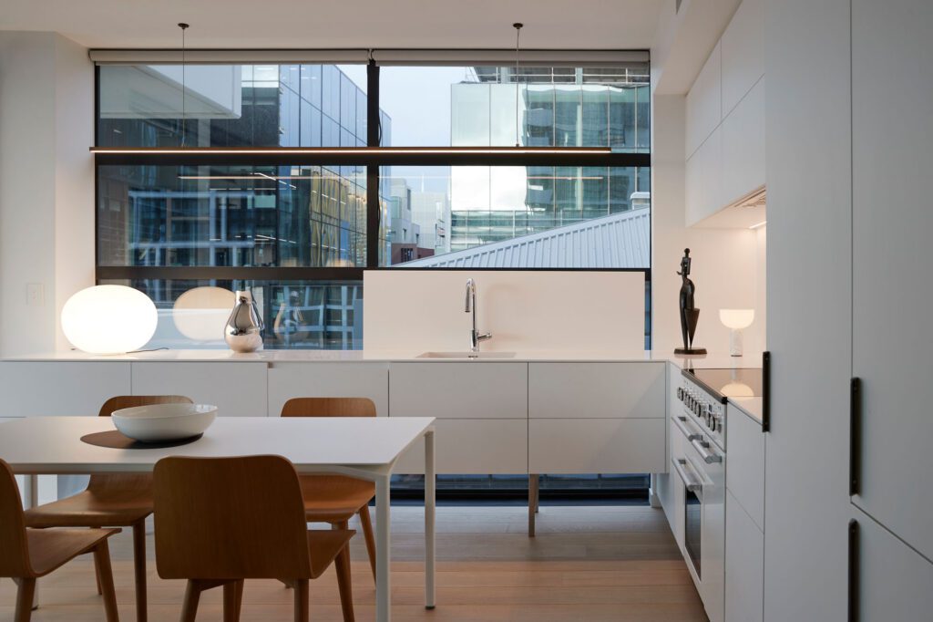 The clients are fond of side lighting and, given the compact footprint, they didn’t want heavy overhead lighting. The downlights were replaced with smaller, dimmable fittings, and under-cabinet lighting with table lighting from Slow Store and ECC provides a soft ambient glow. Adding character without obstructing the outlook, a 2.8m Powersurge Lateral pendant hangs gracefully in the eastern part of the kitchen.