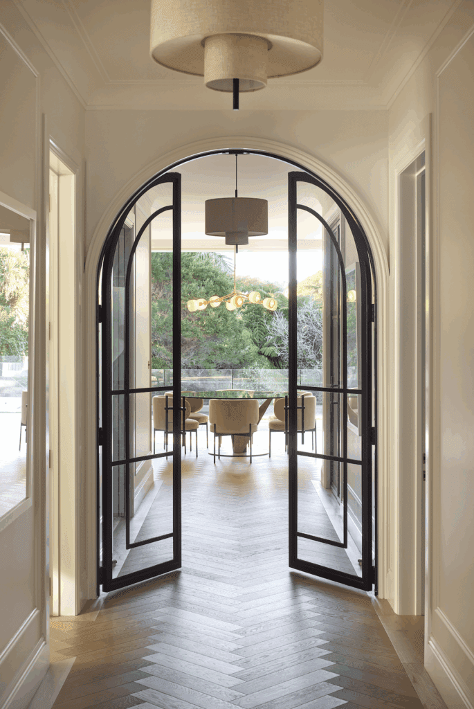 Circular motifs recur: a crafted arched steel door, rounded ceiling mouldings, and even the artwork selected by the clients. This repetition establishes a language of soft geometry within the house’s otherwise linear rigour.