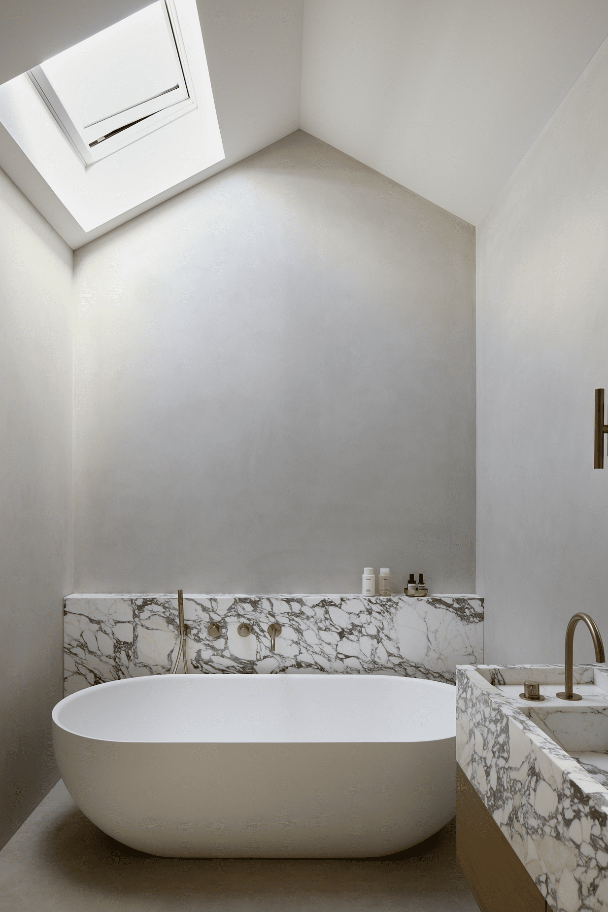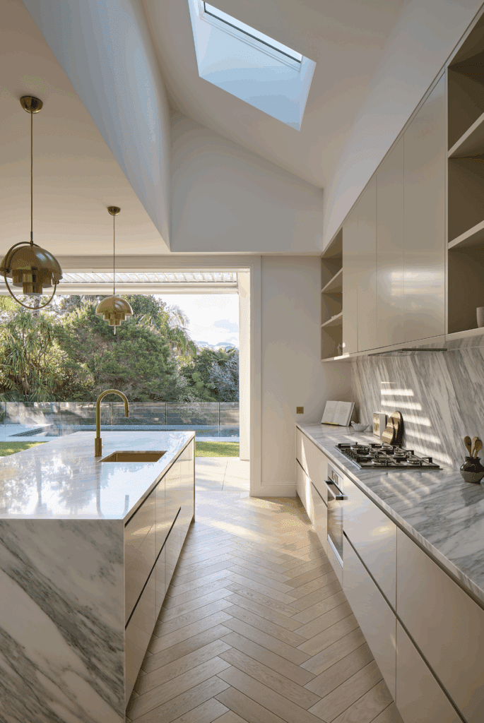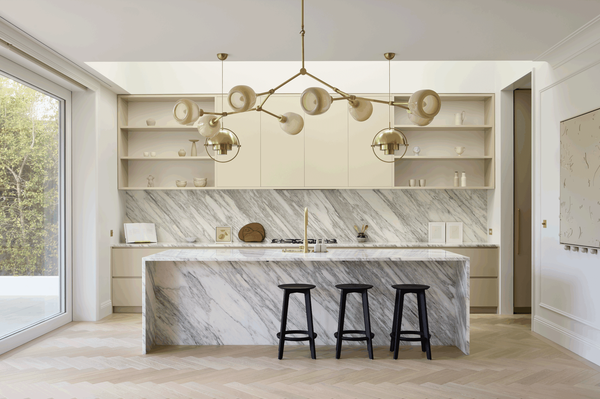 The architecture finds its richness in materials and junctions, where restraint is paired with exquisite detailing. The engineered timber flooring laid in herringbone runs throughout the ground floor and stairs, setting a warm, textural foundation. The Arabescato Carrara marble in the kitchen provides a theatrical counterpoint, further dramatised by taupe lacquered cabinetry, chosen in close collaboration with the client.