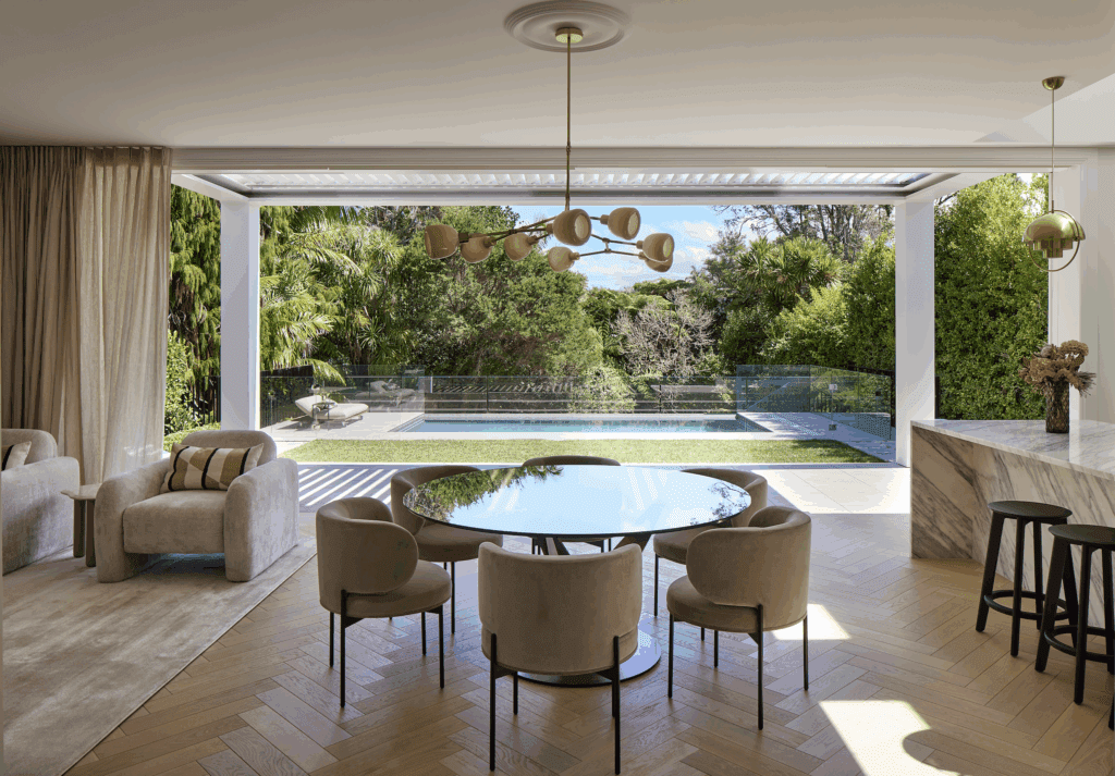 If the exterior signals understatement, the interior delights in restrained elegance. Symmetry governs progression, with axial views culminating in the bush landscape. Lighting, carefully considered, adds drama without spectacle — skylights wash walls with daylight from above, an intervention that subtly modernises the Georgian mood.