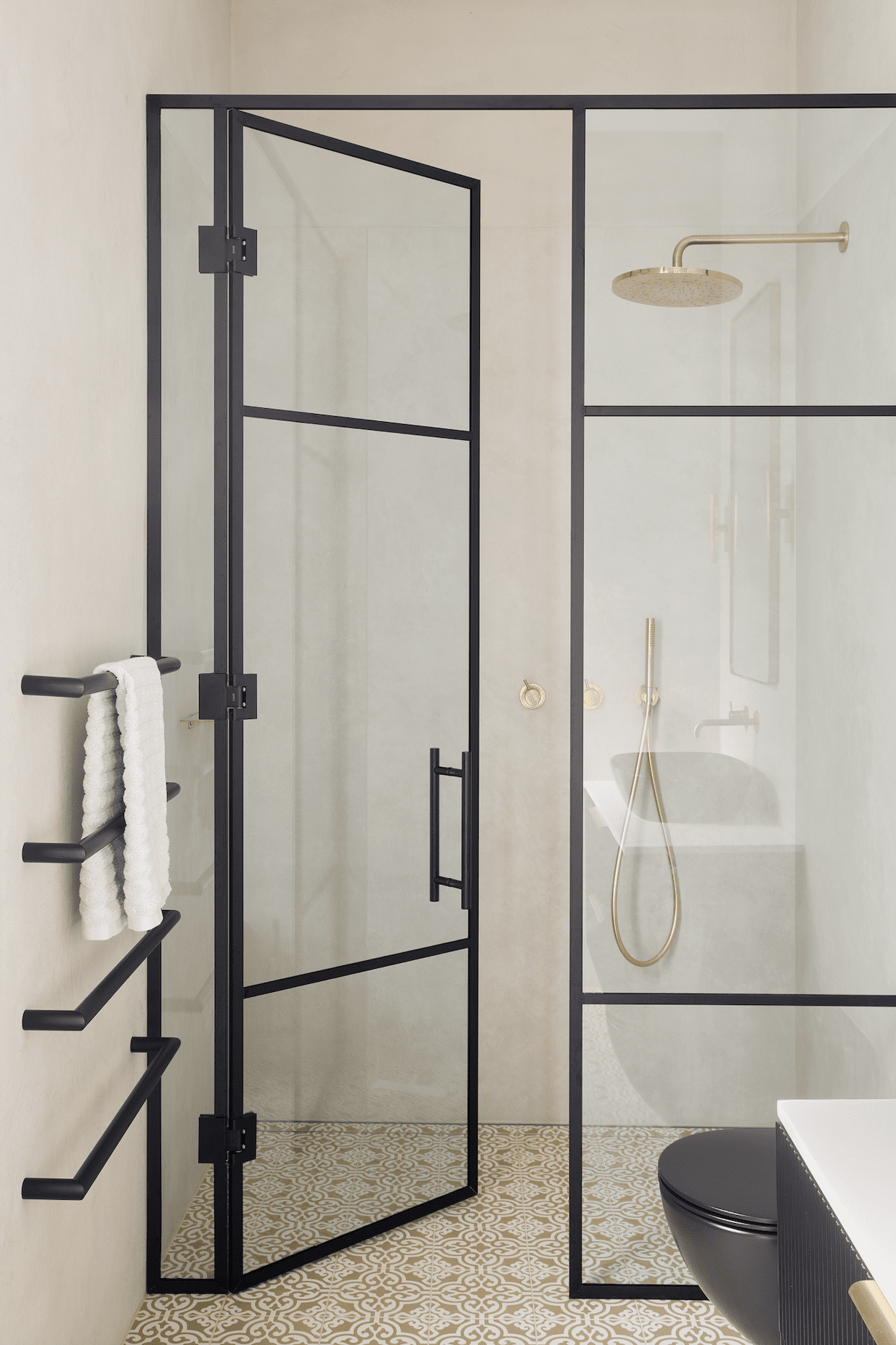 Brushed brass fittings throughout — from tapware to door hardware and shower drains — add a warm gleam that contrasts with the otherwise restrained palette.