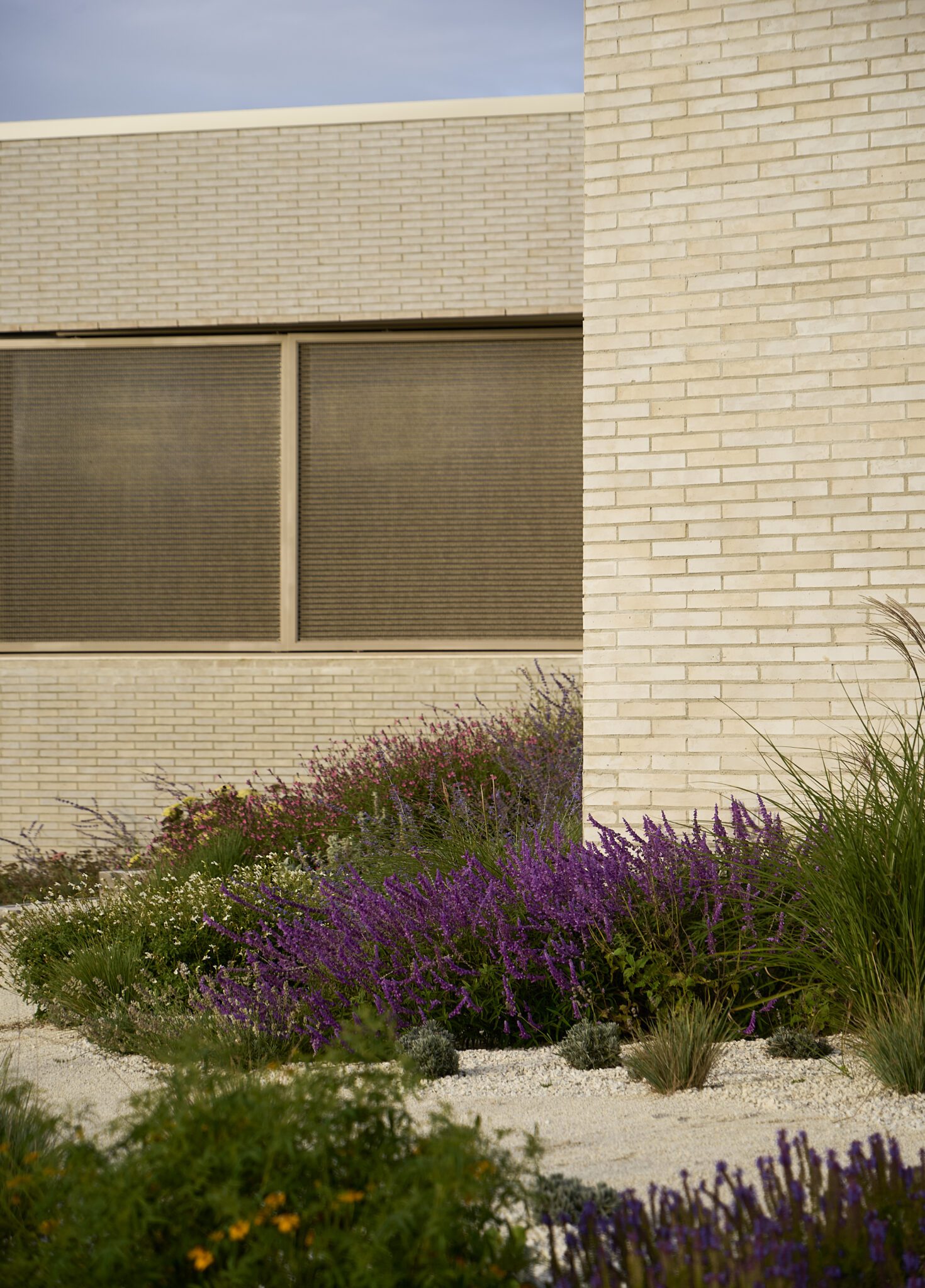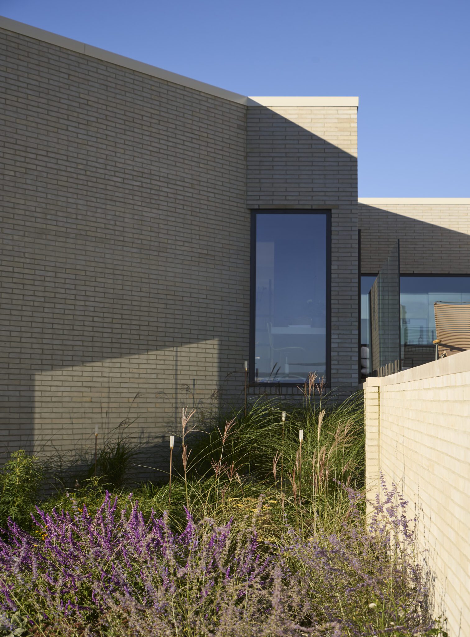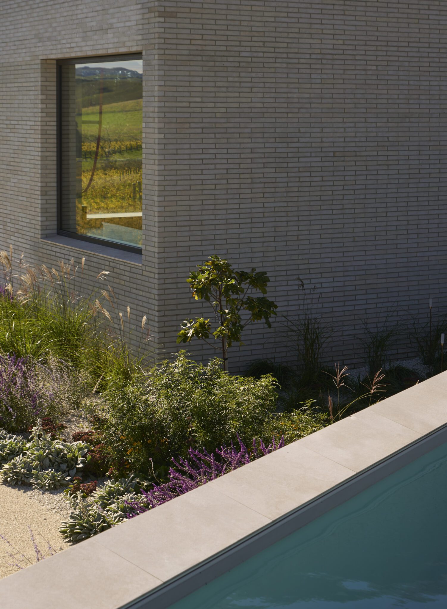 From below, this building reads as a continuous, light-toned mass; robust, certainly, but not alien. Its material palette deliberately echoes the pale limestone soils and chalky strata geology of the region. While the home is clad in brick rather than stone, the intention is clearly to evoke the textural qualities and palette of an exposed limestone face.