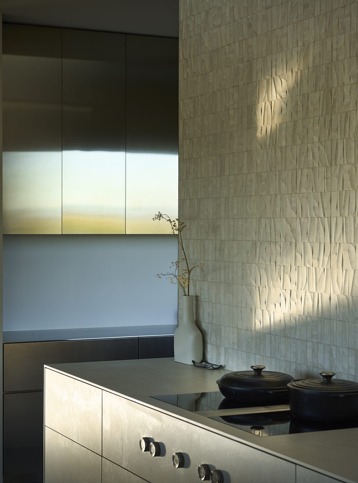 The kitchen exudes modernism with touches of Judd or Haller minimalism, but without the inherent coldness. Light wells above a splashback of Porcelanosa Nantes Caliza Mosaic tiles ensure that the uneven protrusions of the tiles are constantly activated by natural light.