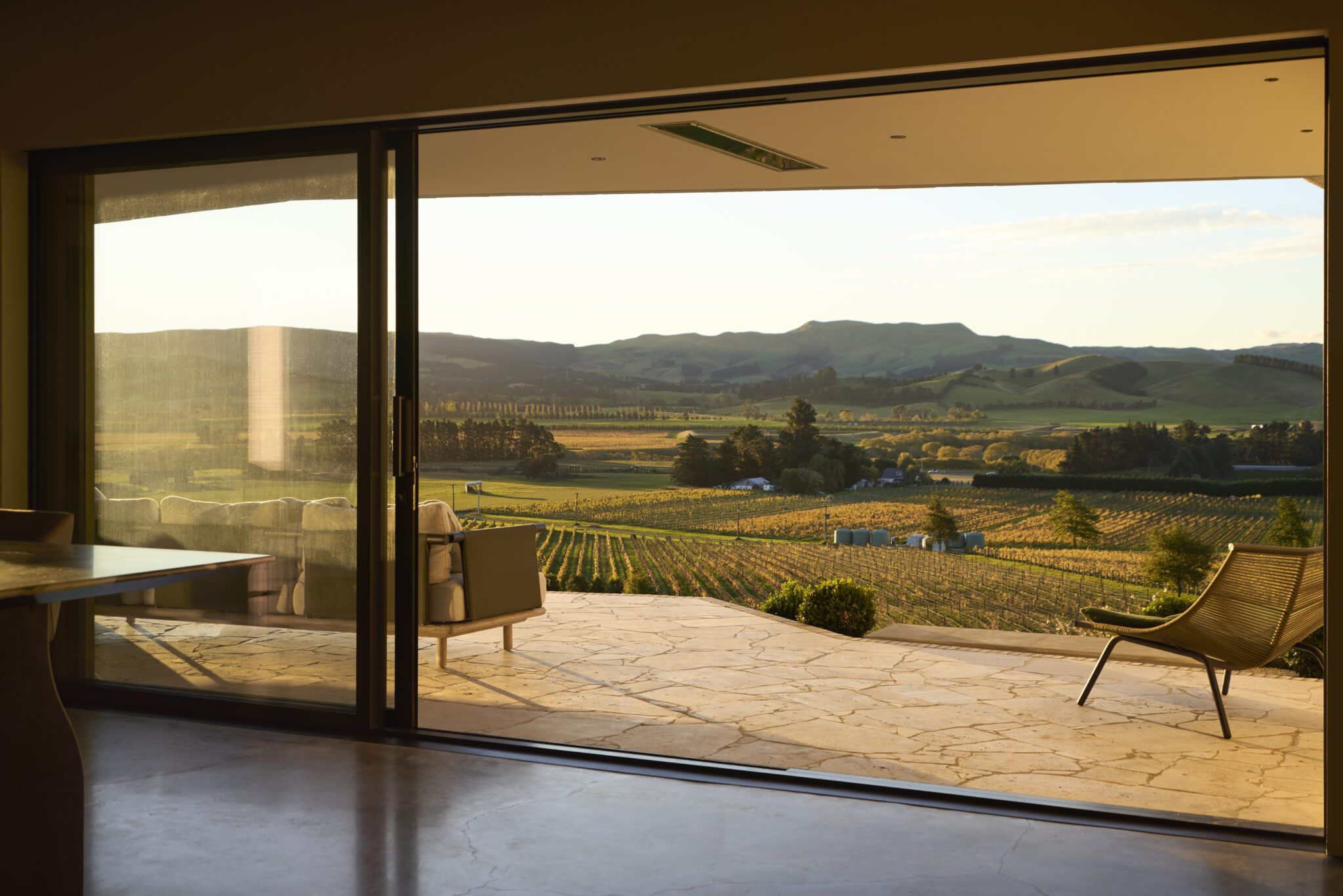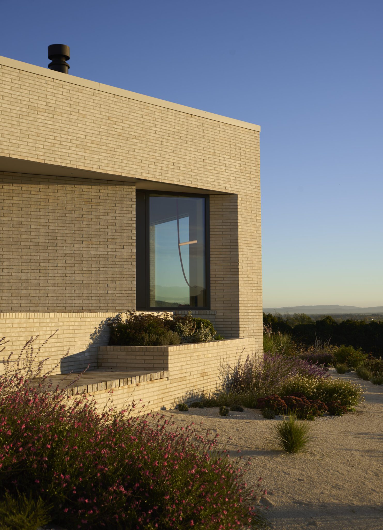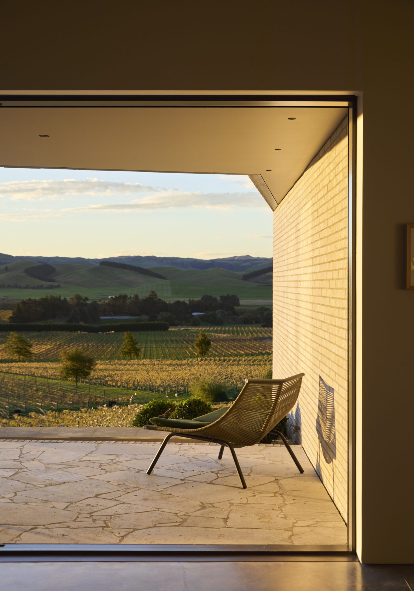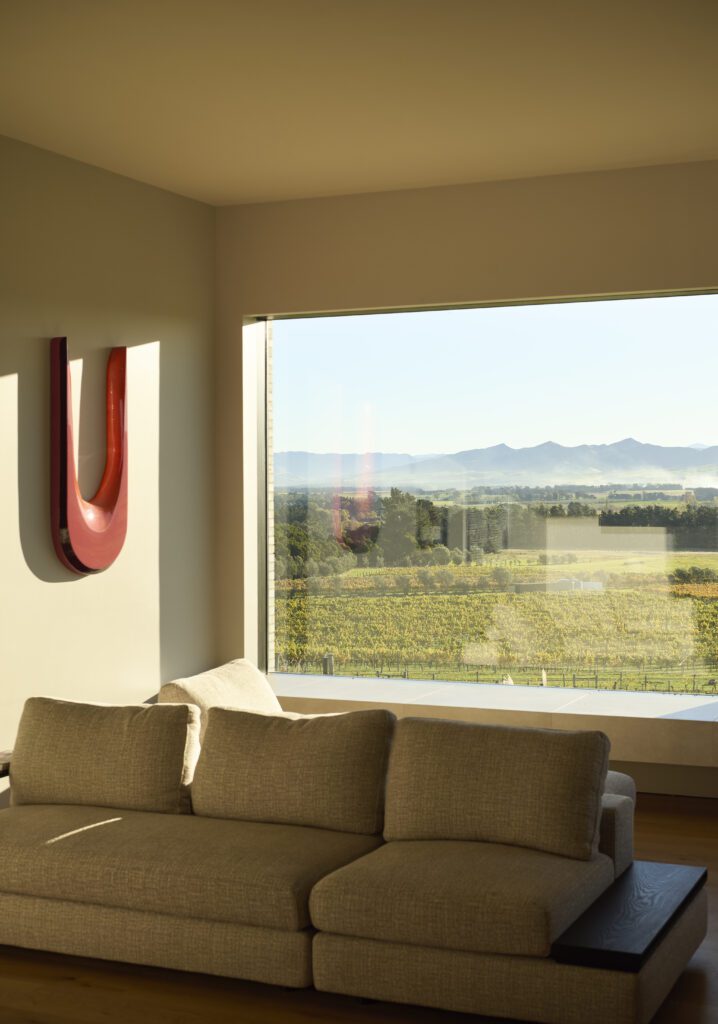 Case explains that the windows are deliberately proportioned as frames, curating moments of the surrounding terrain: distant outcrops, vineyard rows flowing downhill, and long axial views that align living spaces with the land’s natural contours, distant or otherwise.