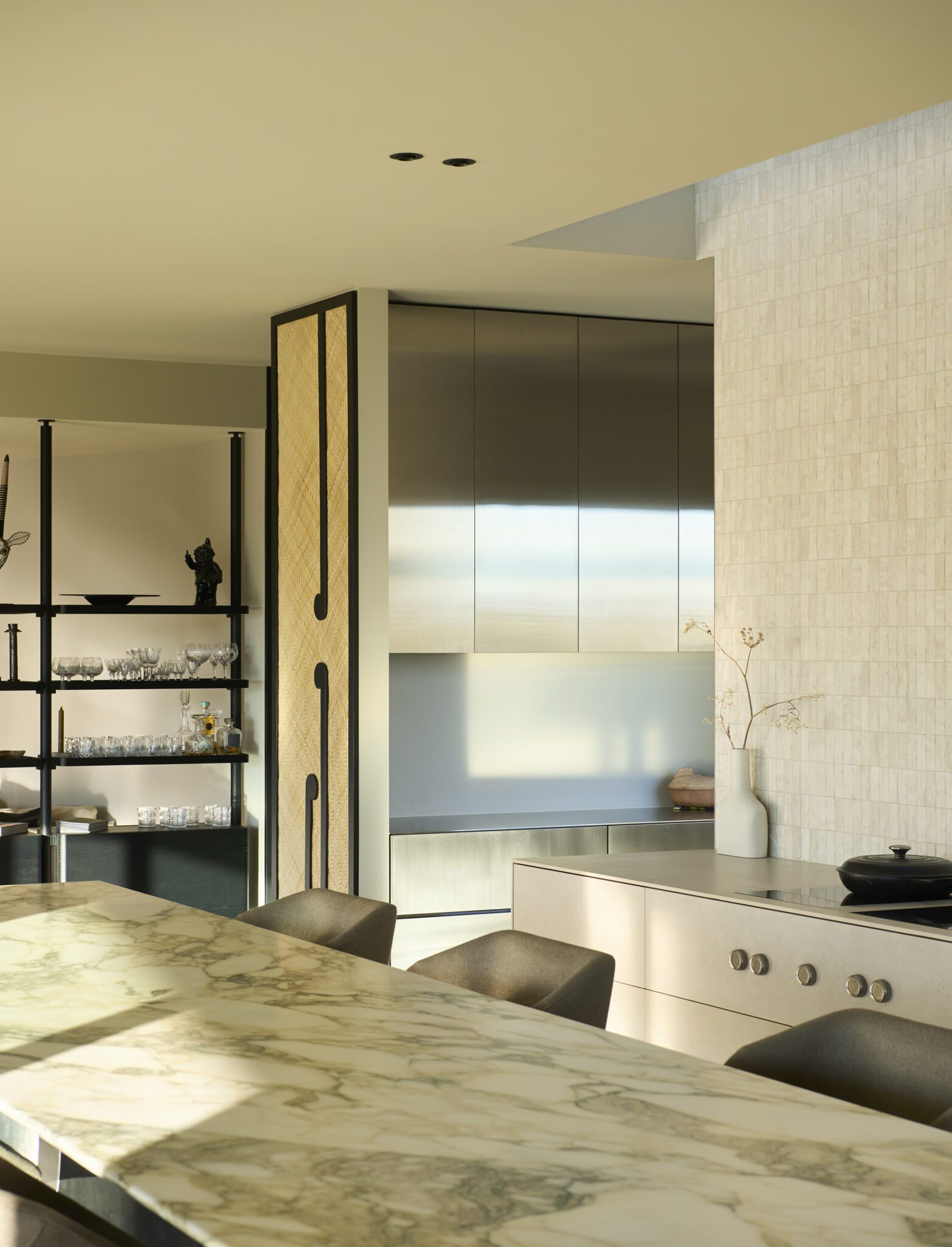 The impressive 4.8-metre dining table/kitchen island was designed by Case and incorporates stone inlays, its steel-blade legs subtly echoing limestone ridgelines.